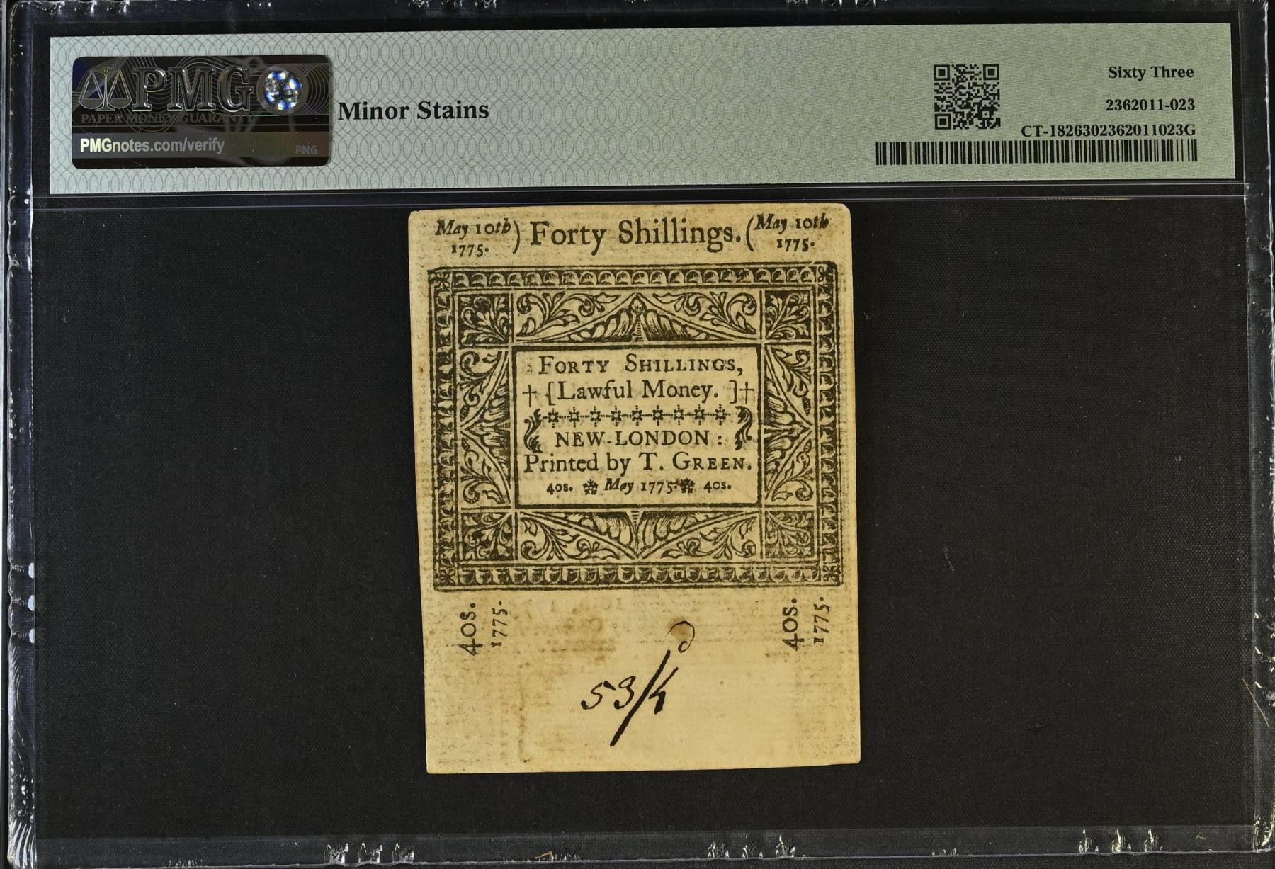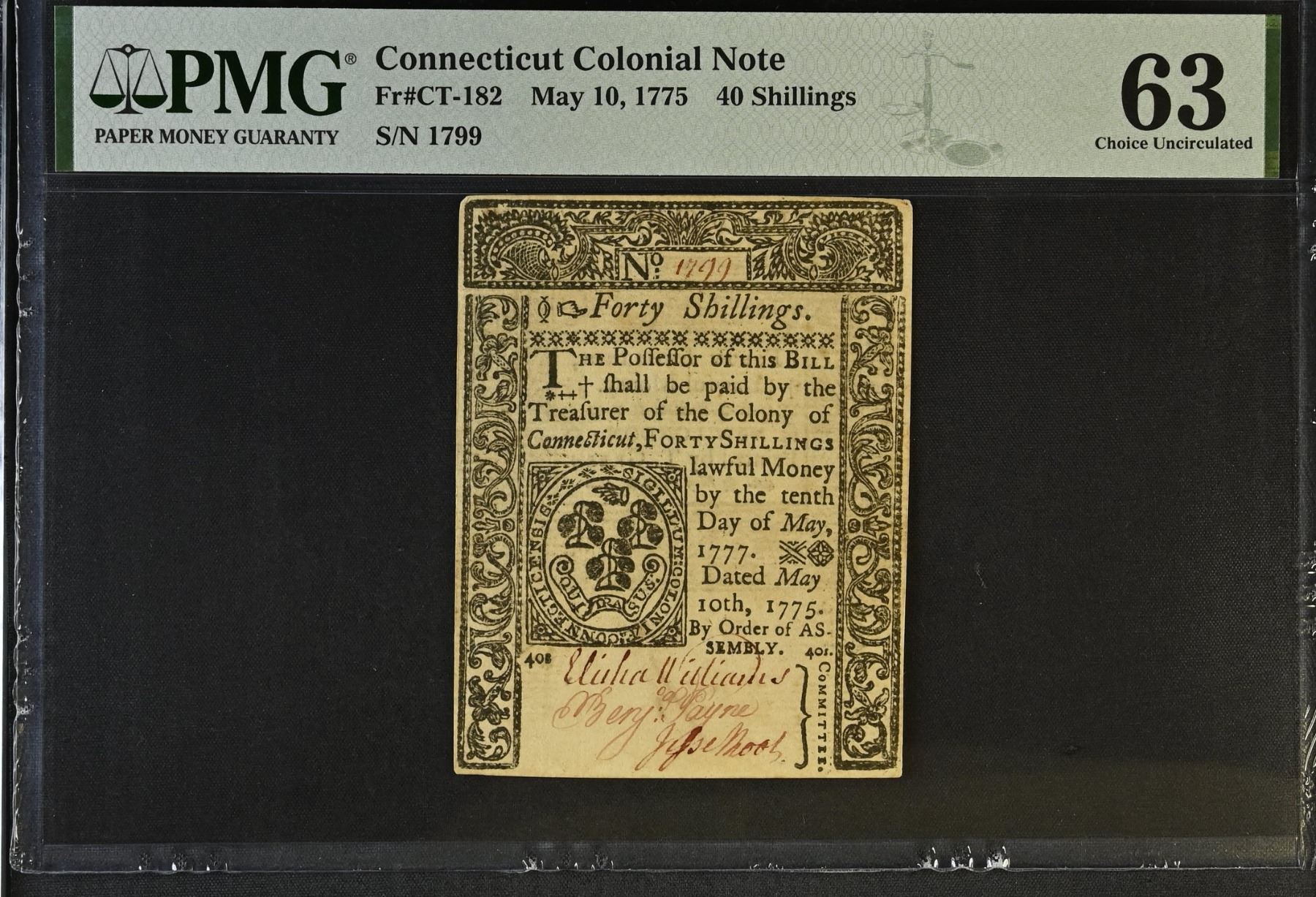 UNITED STATES: Colonial Issues, 40 shillings, 10.5.1775, Pick-S502, Fr-CT-182, Colonial issue printed by T. Green, very light stains, PMG graded MS63, ex Dr. Robert A. Rosenfeld Collection.