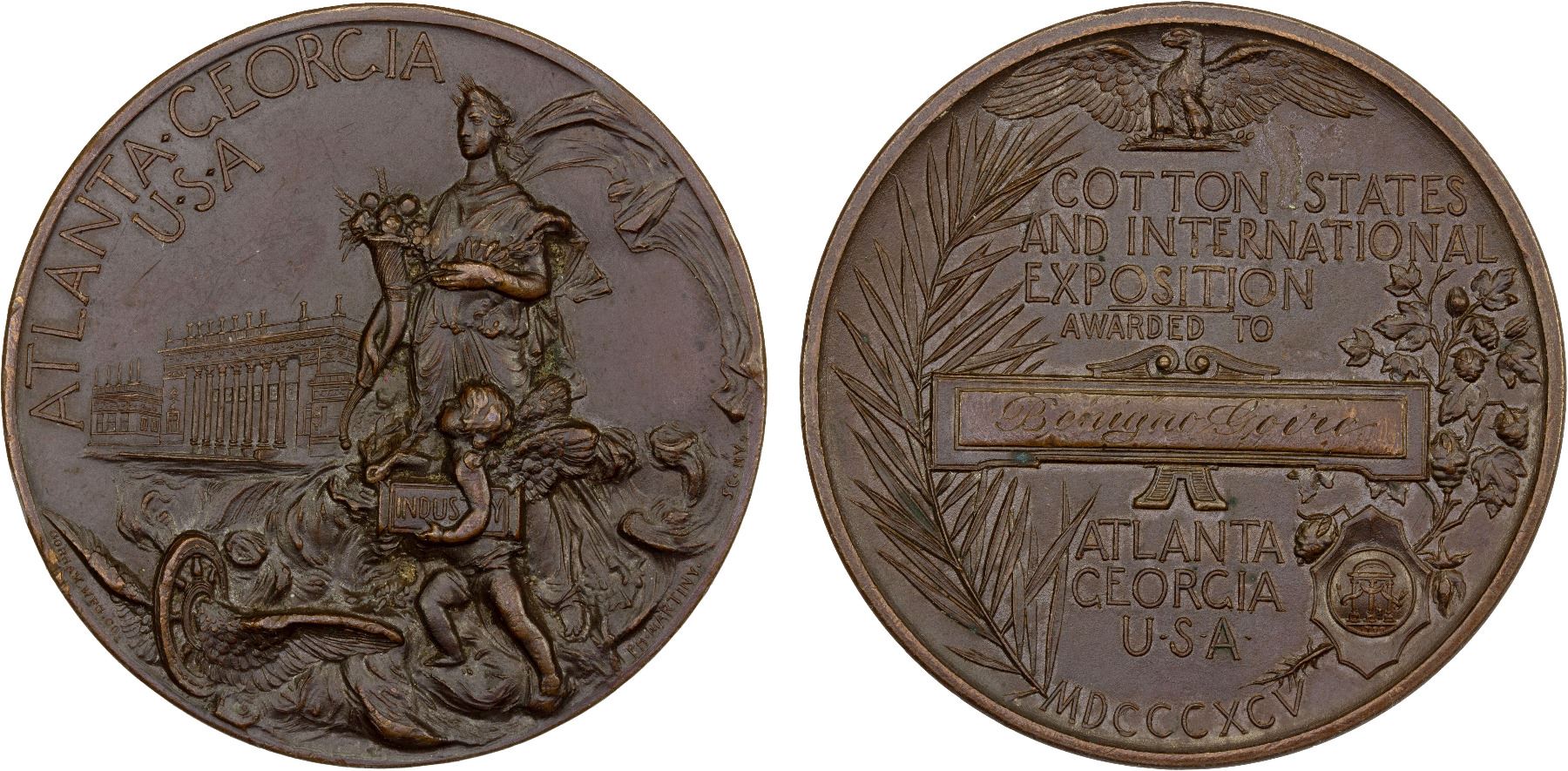 UNITED STATES: Georgia, AE medal, 1895, Harkness-Reg-8, 58mm bronze award medal for the Cotton States and International Exposition by Philip Martiny, Columbia standing three-quarters left holding cornucopia with winged wheel and winged Genius below holding plaque inscribed INDUSTRY, and Palace of Fine Arts in background with ATLANTA GEORGIA / USA around // COTTON STATES / AND INTERNATIONAL / EXPOSITION / AWARDED TO / (engraved script on plaque) Benigno Goire / ATLANTA / GEORGIA / USA / MDCCCXCV with palm branch to left, eagle with wings outstretched above, and a cotton plant and shield at right, tiny reverse spot, nice chocolate-brown color, plain edge, XF-AU, R. The Cotton States Expo, held in Atlanta, Georgia, was designed to show new products and technologies and to promote the American South to the world, and to encourage trade with Latin America. It featured innovative displays in agriculture and technology from different states, and was open for 100 days from September 18 through December 31, 1895. There were 1,573 medals issued during the exposition, 634 in gold, 444 in silver, and 495 in bronze.
