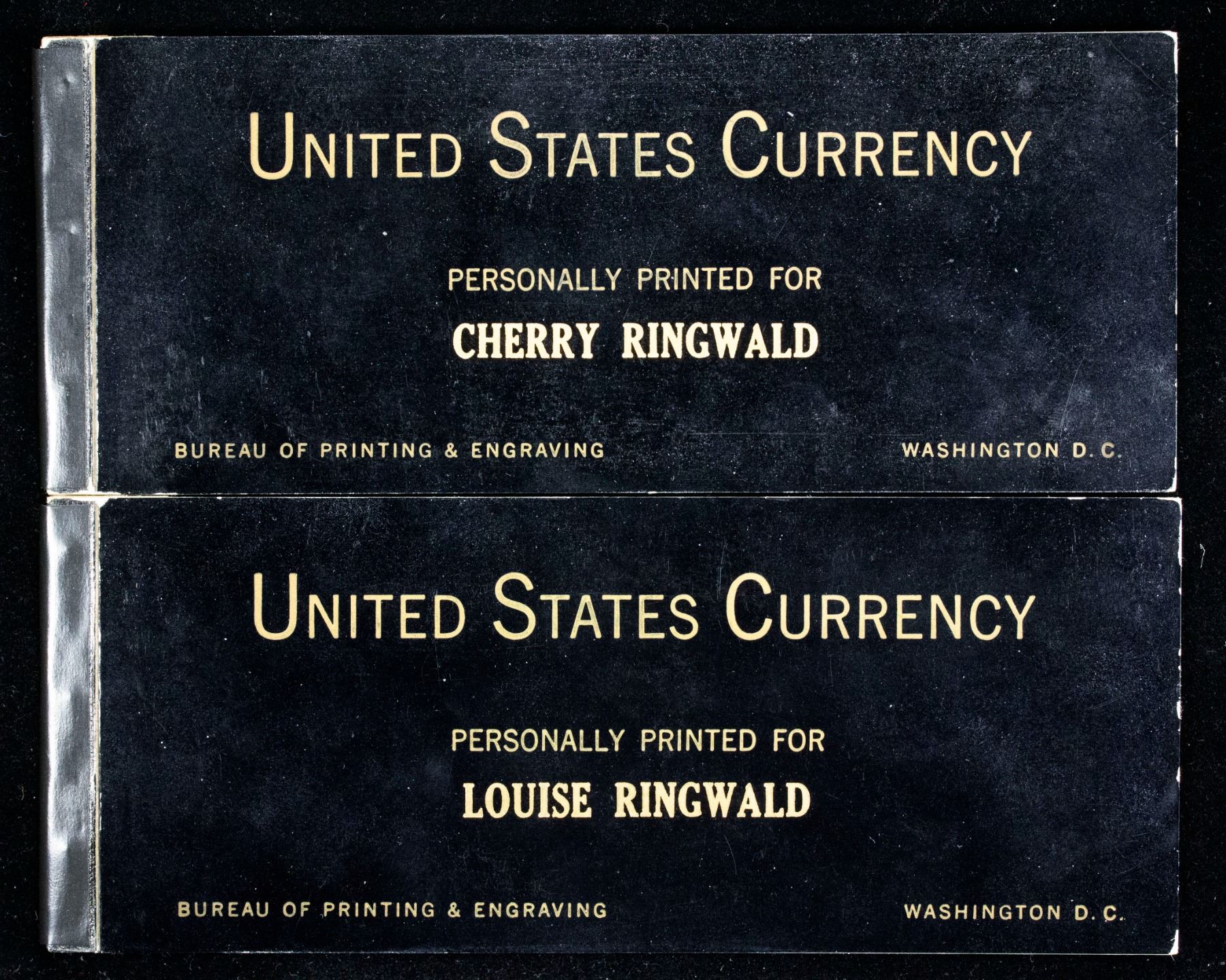 UNITED STATES: LOT of 2 currency booklets, U.S. currency booklets "Personally Printed for Louise Ringwald and Cherry Ringwald" by Cashcraft Co., 20 consecutive serial number Series 1957 $1 silver certificates (10 notes in the Cherry Ringwald booklet), additional $5 Federal Reserve note in the Louise Ringwald booklet; notes are Choice Uncirculated and are bound into booklets and can be removed for use, retail value $225, lot of 2 booklets. Cashcraft Co. makes it sound like these were printed personally by the Bureau of Printing and Engraving for these individuals, when in fact they were only bound personally for them. 10 notes must have been used from the Cherry Ringwald booklet.