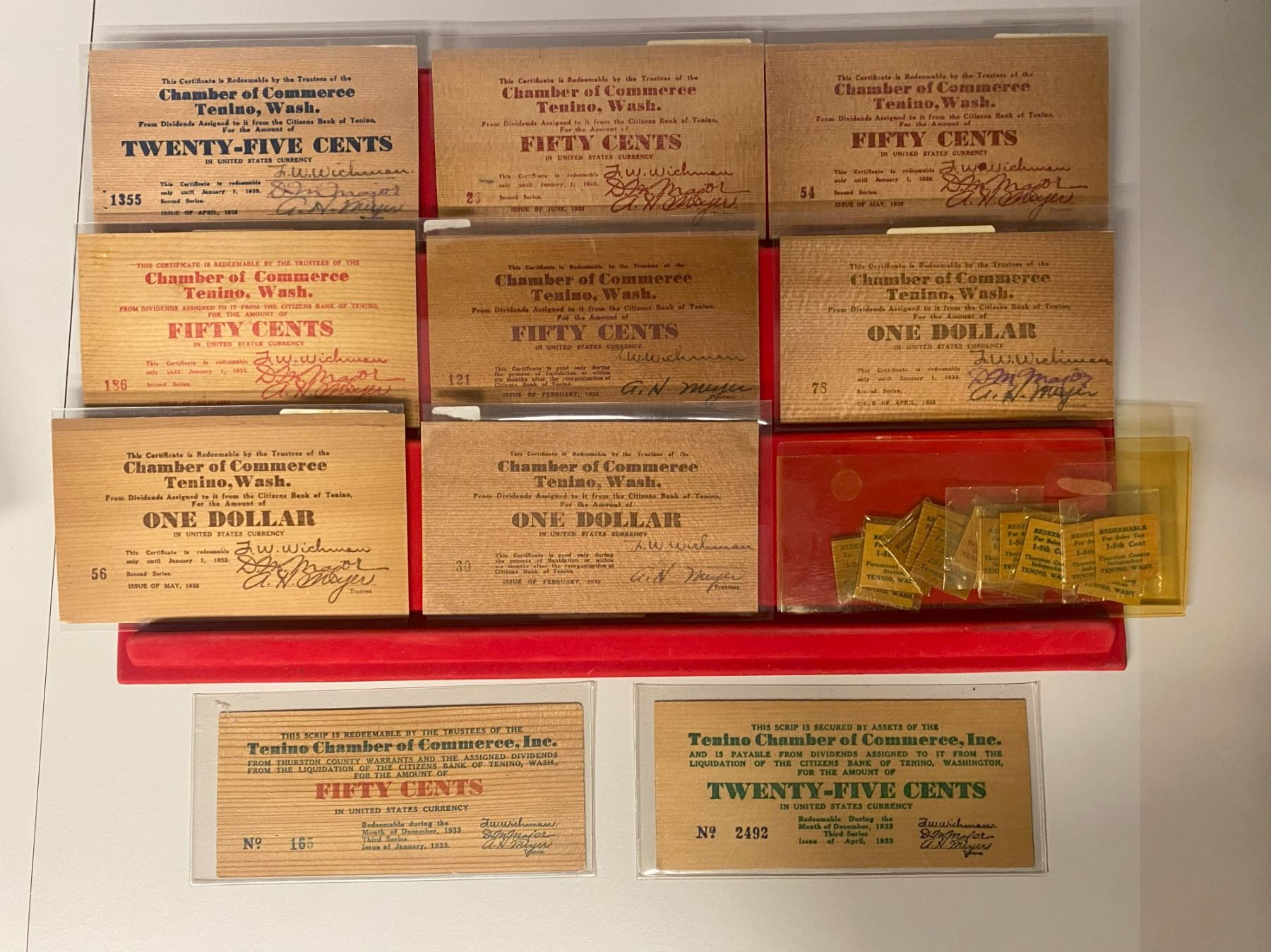 UNITED STATES: LOT of 24 notes, Depression Script, Tenino, Washington State: Chamber of Commerce 1934 Second Series printed on red cedar wood 25 cents (1), 50 cents (4), 1 dollar (3), 1933 Third Series printed on red cedar wood 25 cents (1), 50 cents (1), plus 1/5 cent sales tax printed on red cedar wood Tenino Cash Market (1), L. A. McLain (1), Paramount Service Station (2), Penny's Garage (1), Jiffy Lunch (2), Thurston County Independent newspaper (1), same with donkey and cigar back (1), donkey left dated 1935 (2), donkey right dated 1935 (3), average quality examples, retail value $150, lot of 25 banknotes, ex Robert A. Rosenfeld Collection.