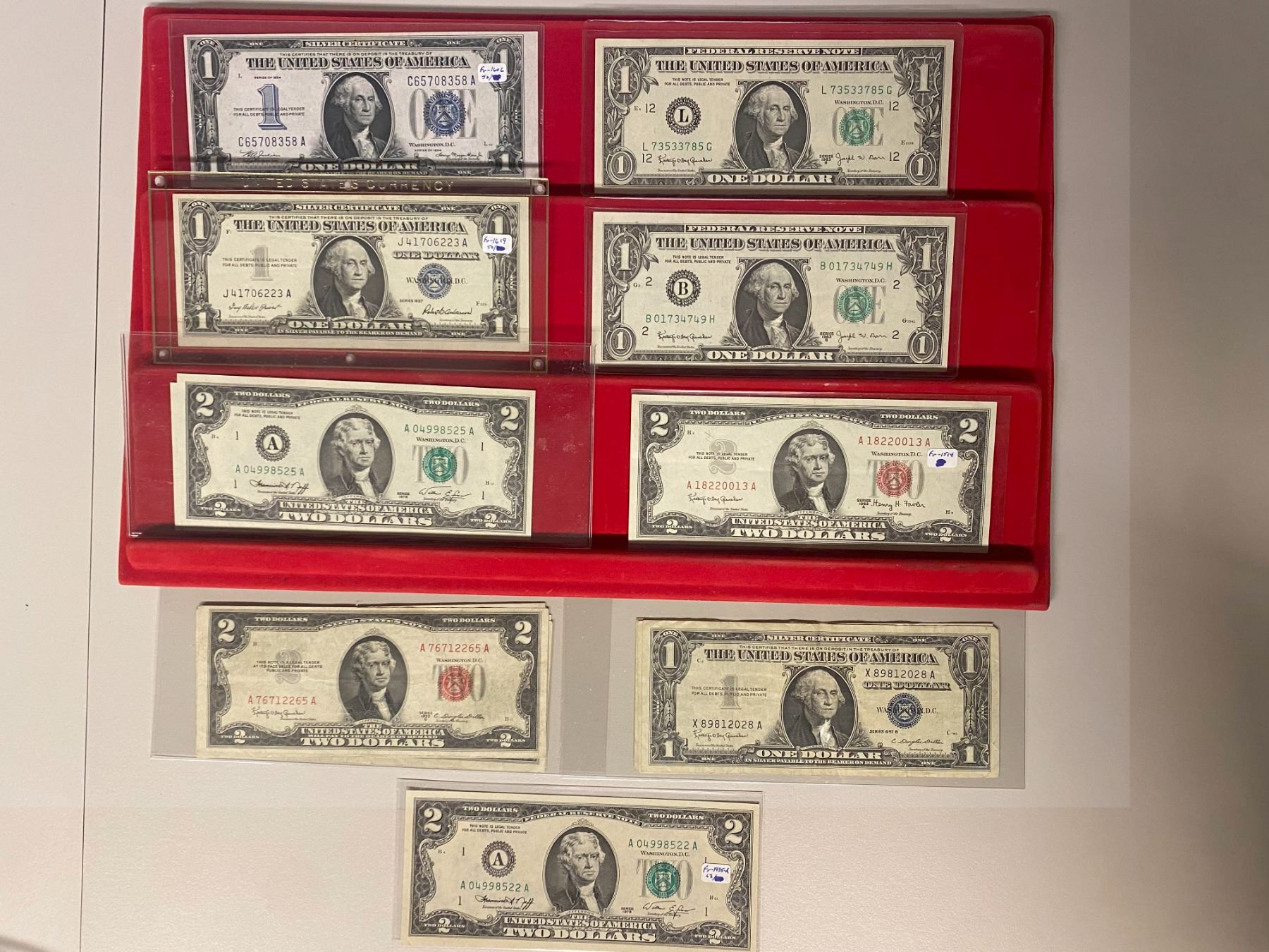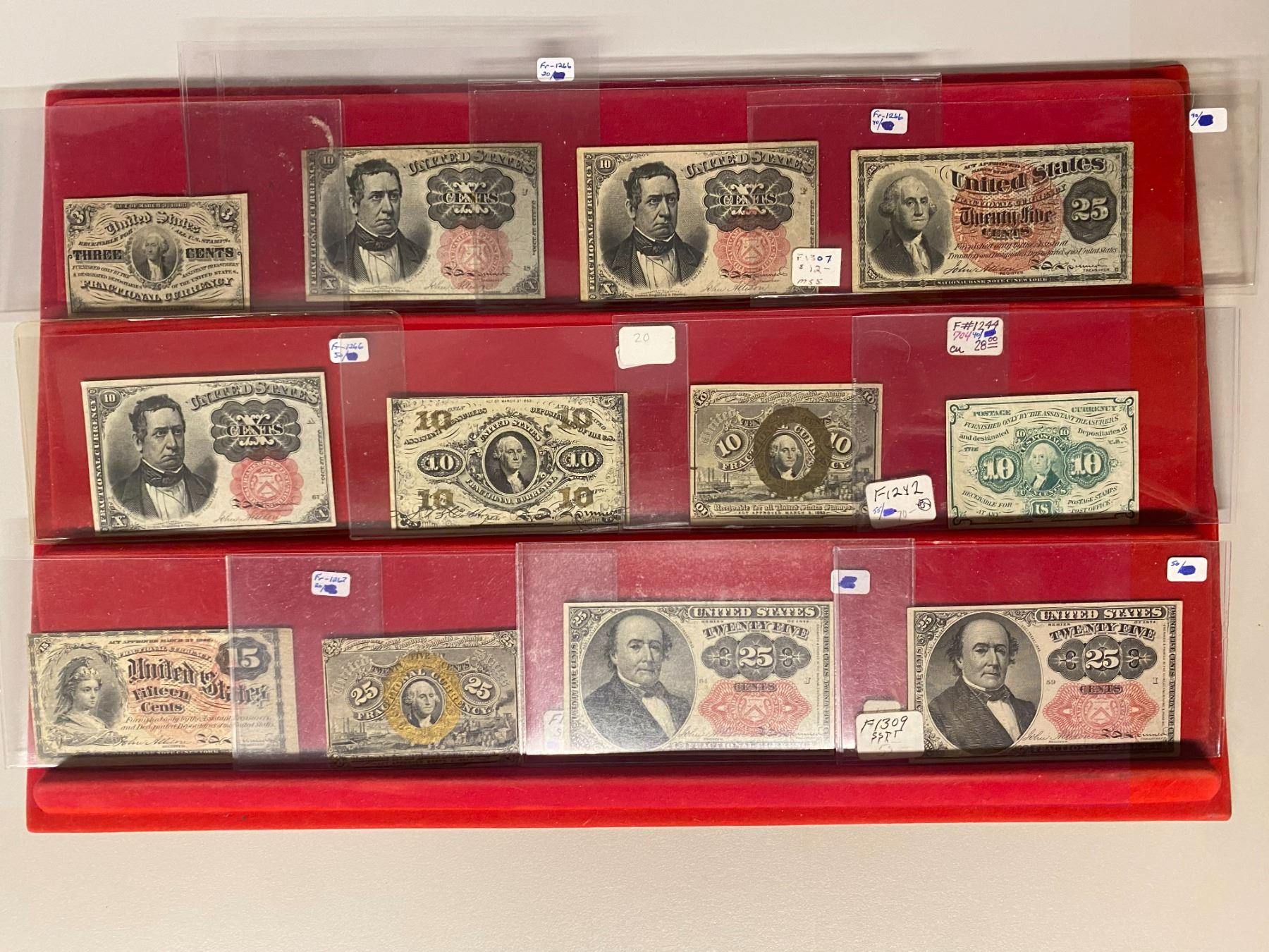 UNITED STATES: LOT of 31 notes, including Fractional Currency: 3 cents (1 pc), 10 cents (6), 15 cents (1), and 25 cents (4); and Small Size notes: dollar (8) and 2 dollars (11); average circulated grades, as well as some uncs, in consignor's holders, viewing recommended; retail value $850, lot of 31 pieces, ex Dr. Robert A. Rosenfeld Collection.