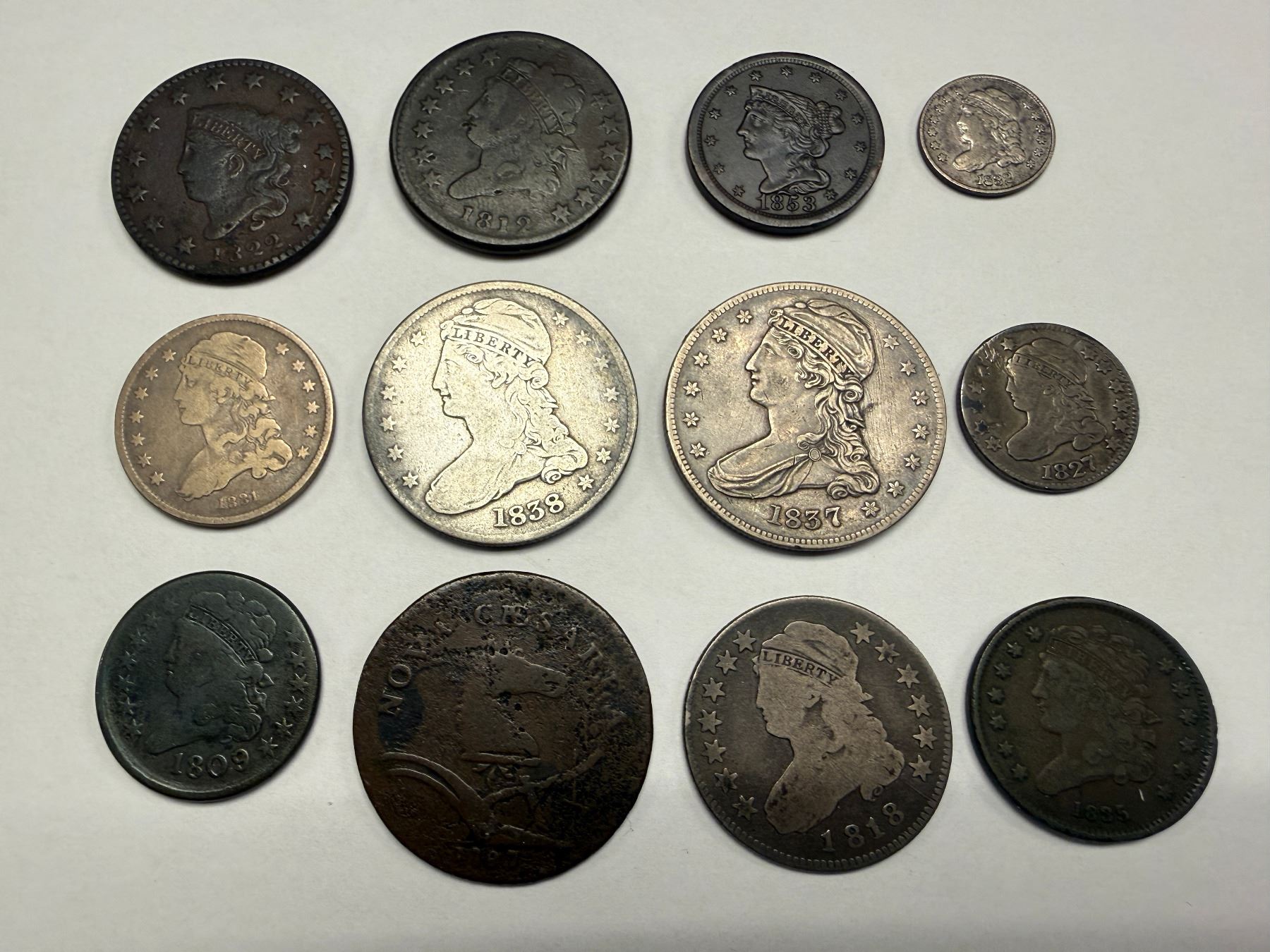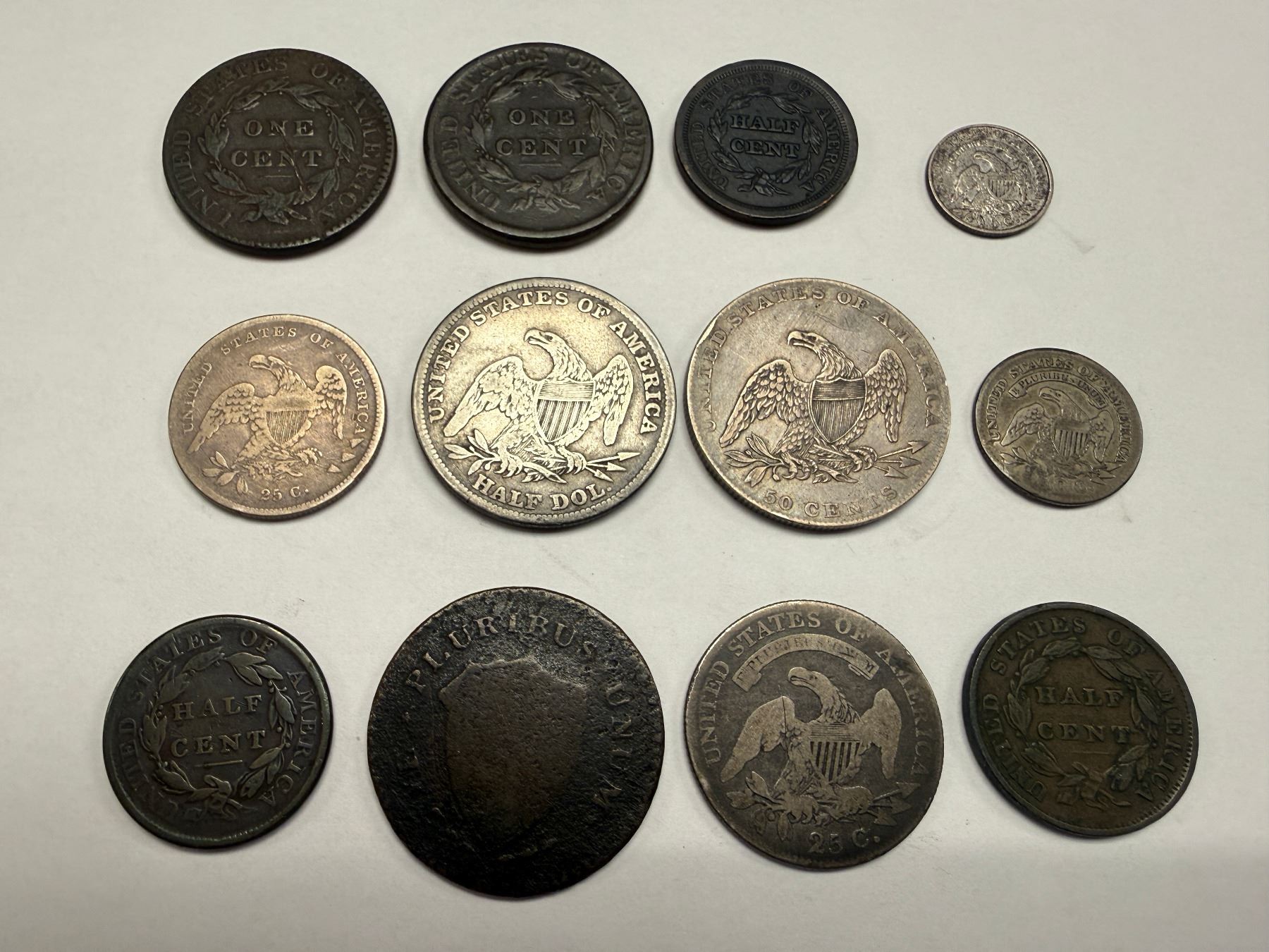 UNITED STATES: LOT of 33 AR coins, including 6 Liberty cap (2 halves, 2 quarter, 1 dime and 1 1/2 dime), 3 1/2 cents, 3 large and 4 small cents, 3 proof commemorative silver dollars, a New Jersey cent, 2 hard time tokens, and 11 others; retail value $650, lot of 33 pieces.