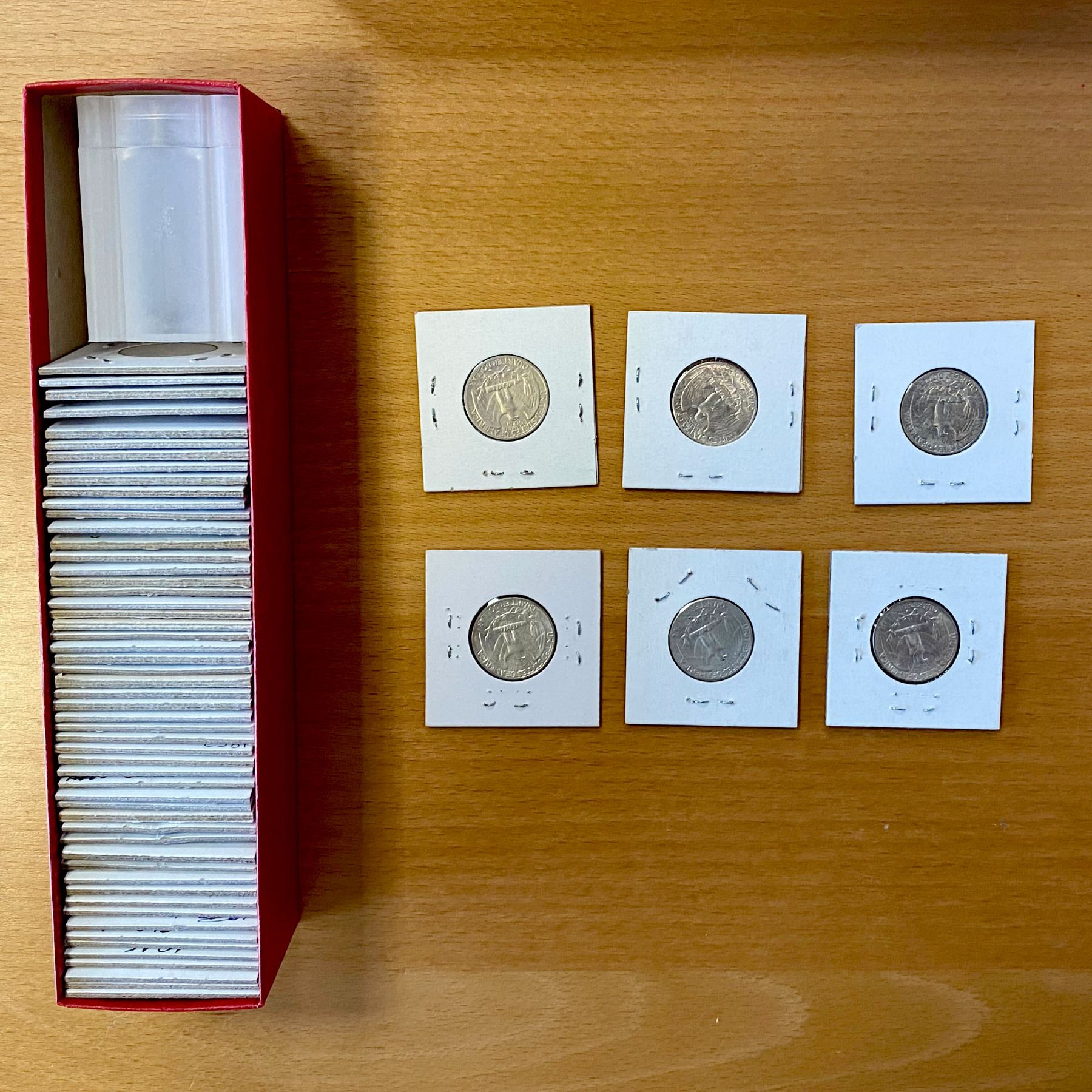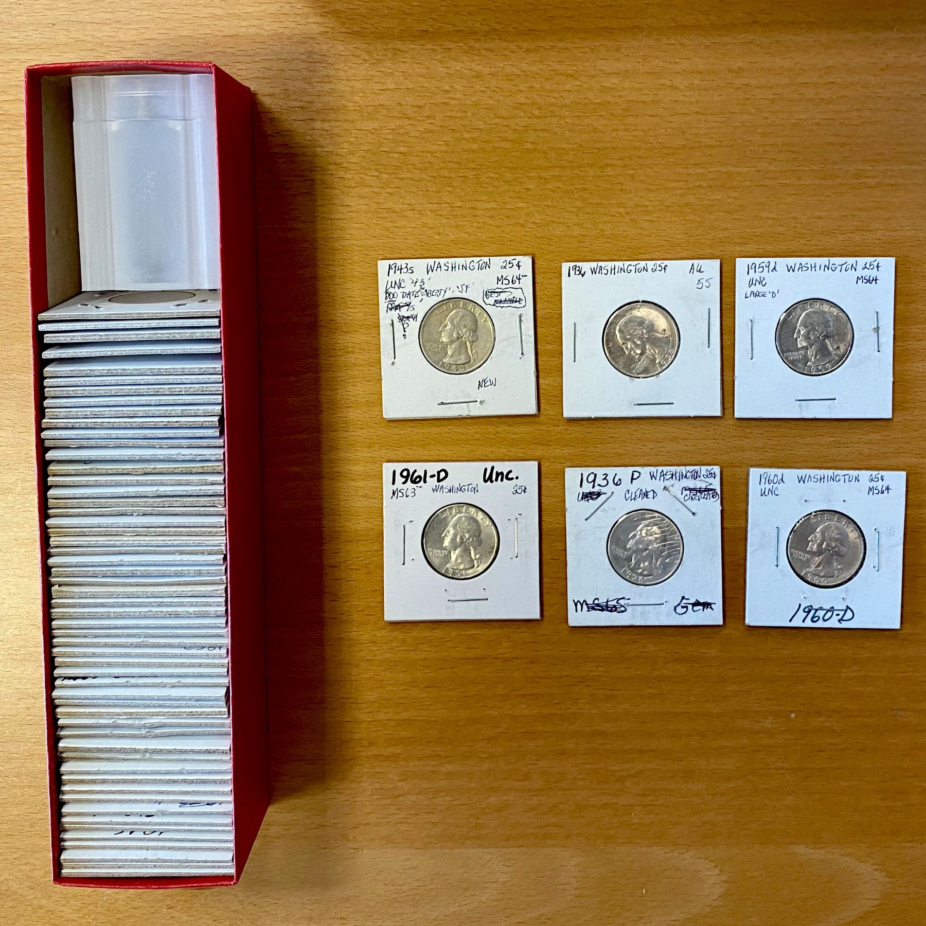 UNITED STATES: LOT of 60 silver coins, including 59 Washington silver quarters and one silver Roosevelt dime, most are Uncirculated, in 2x2 holders, from 1936-1962, viewing recommended, retail value $675, lot of 60 pieces.