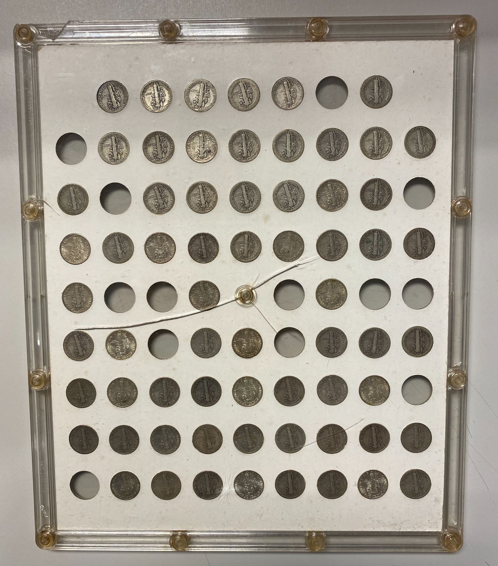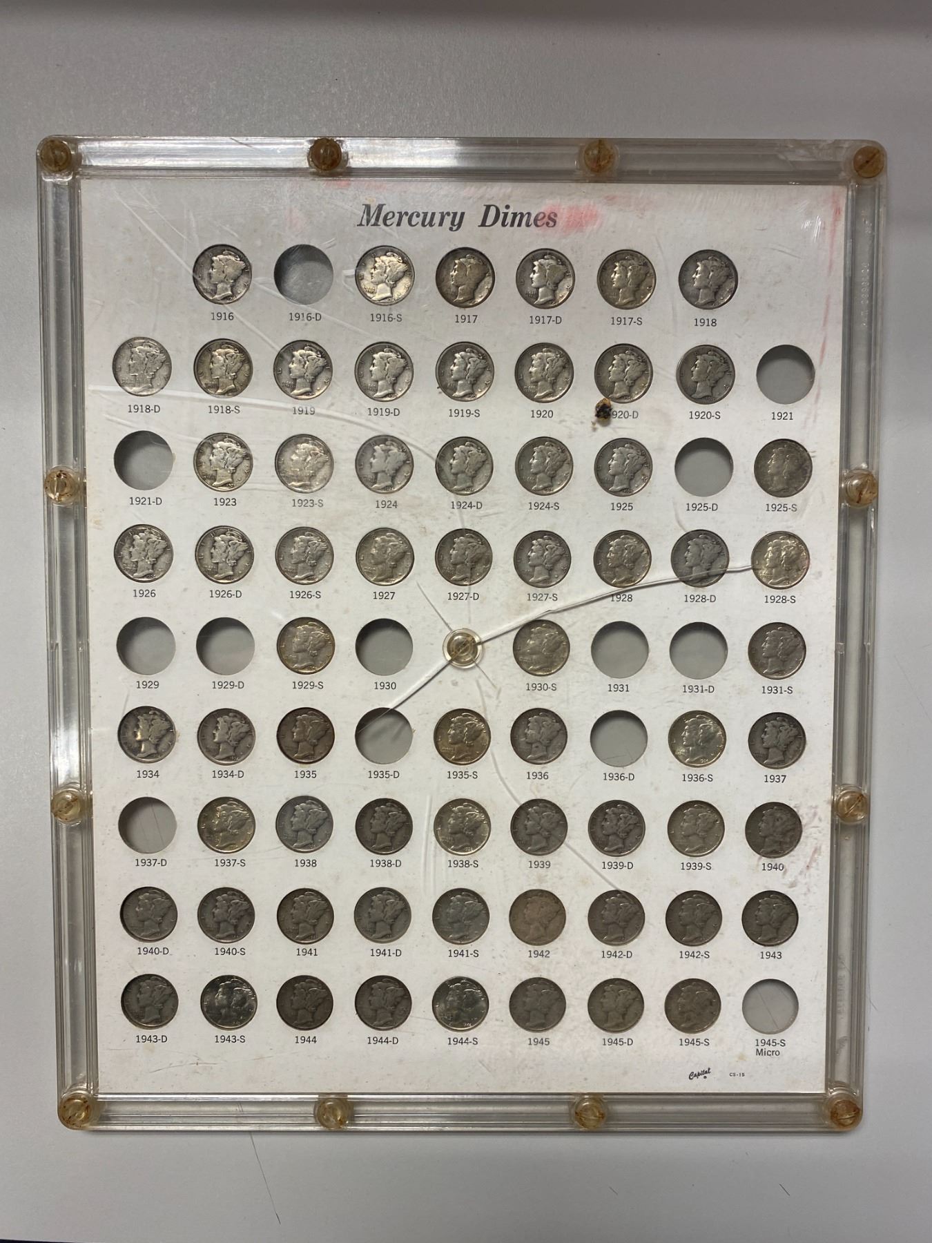 UNITED STATES: Mercury dime partial set, KM-140, complete except for 1916-D, 1921, 1921-D, 1925-D, 1929, 1929-D 1930, 1931, 1931-D, 1935-D, 1936-D, 1937-D, and 1945-S Micro S; average circulated grades, as well as a couple uncs, generally better than average (especially the S mints), in beat up Capital Plastics holder, viewing recommended; retail value $725, set of 65 coins.