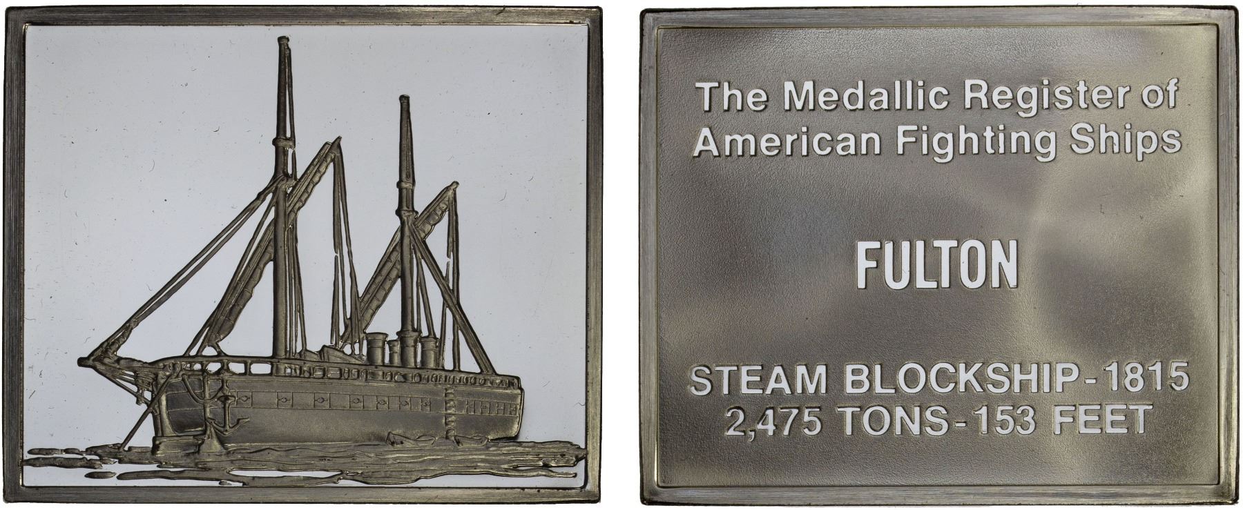 UNITED STATES:, ND (ca. 1980?) silver art bar, 32x38mm (27.15g) silver art bar of the Blockship Fulton by the Franklin Mint, view of the ship with sails down // "The Medallic Register of / American Fighting Ships / FULTON / STEAM BLOCKSHIP - 1815 / 2,475 TONS - 153 FEET", a few hairlines, STERLING on edge with four hallmarks, Proof.