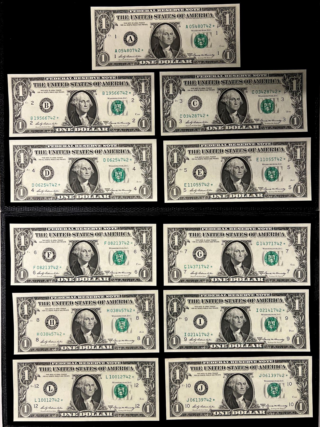 UNITED STATES: SET of 11 banknotes, 1969-A, Friedberg-1904-A* through J* and L*, complete bank set of star notes (no Dallas star notes produced), set of 11 pieces, Choice UNC.