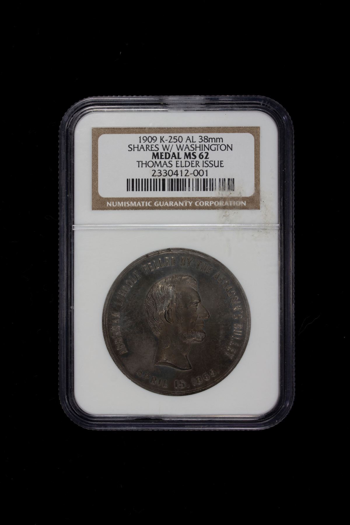 UNITED STATES: aluminum medal, 1909, King-250, DeLorey-51, Cunningham-10-440GS, 38mm, "Centennial of Lincoln's Birth" medal by Thomas Elder, ABRAHAM LINCOLN FELLED BY THE ASSASSIN'S BULLET / APRIL 15 1865 around bust of Lincoln right // HE SHARES EQUALLY / WITH / WASHINGTON / THE / VENERATION / OF HIS / COUNTRY, in older generation NGC holder, NGC graded MS62, RR, ex SARC Auction 33, Lot 2564. In 1902 Thomas Elder issued the first of a long series of dealer store cards, personal tokens, political pieces and other commemorative tokens. The dies for this aluminum medal were produced by Hanson in Chicago. Presumably, Hanson also struck the pieces. The issue's mintages are as follows: Silver 5-6, German Silver 5-6, Copper 5-6, Brass 6-10, White Metal 6, Aluminum 50, and Lead 6.