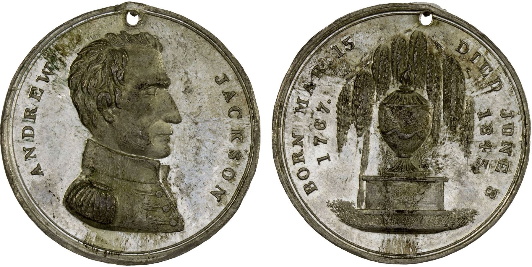 UNITED STATES: token (6.67g), 1845, Saterlee-AJ-29, 28mm white metal medal on the Death of Andrew Jackson by Kettle & Sons, Birmingham, uniformed bust right with ANDREW - JACKSON around // funeral urn on pedestal with weeping tree at left and above, with BORN MAR. 15 / 1767 - DIED JUNE 8 / 1845 around, pierced for suspension, as is common, some minor staining, plain edge, XF. Interestingly, the year dates on the reverse are repunched over smaller dates.