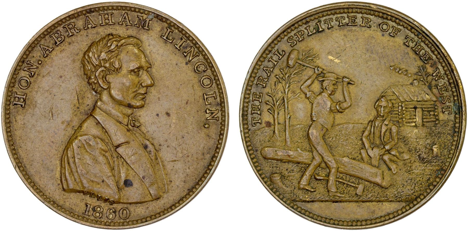 UNITED STATES: token (9.96g), 1860, King-38, DeWitt-AL-1860-41, Cunningham-1-500B, Saatterlee-285, Zabriskie-94, 28mm brass campaign token for Abraham Lincoln by Darwin Ellis for Scovill Manufacturing Company in Waterbury, Connecticut, bust right with "HON. ABRAHAM LINCOLN - 1860" around // Lincoln and a helper splitting rails with a log cabin at right and THE RAIL SPLITTER OF THE WEST around, small spot on bust, plain edge, Choice VF. This is one of the first pieces made for the first campaign. Many have been holed to wear as campaign badges on a lapel.