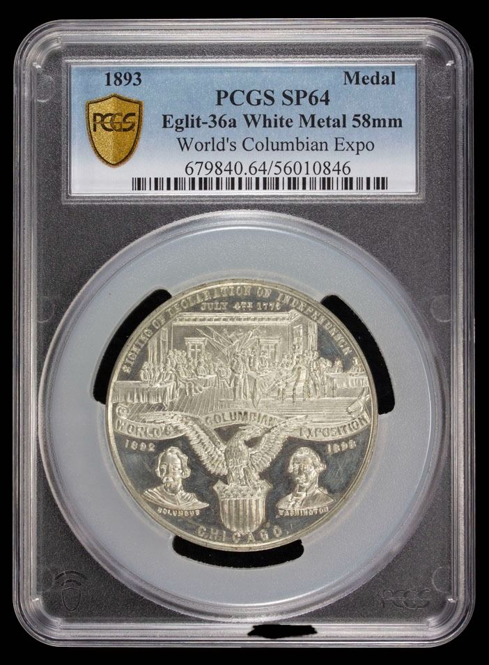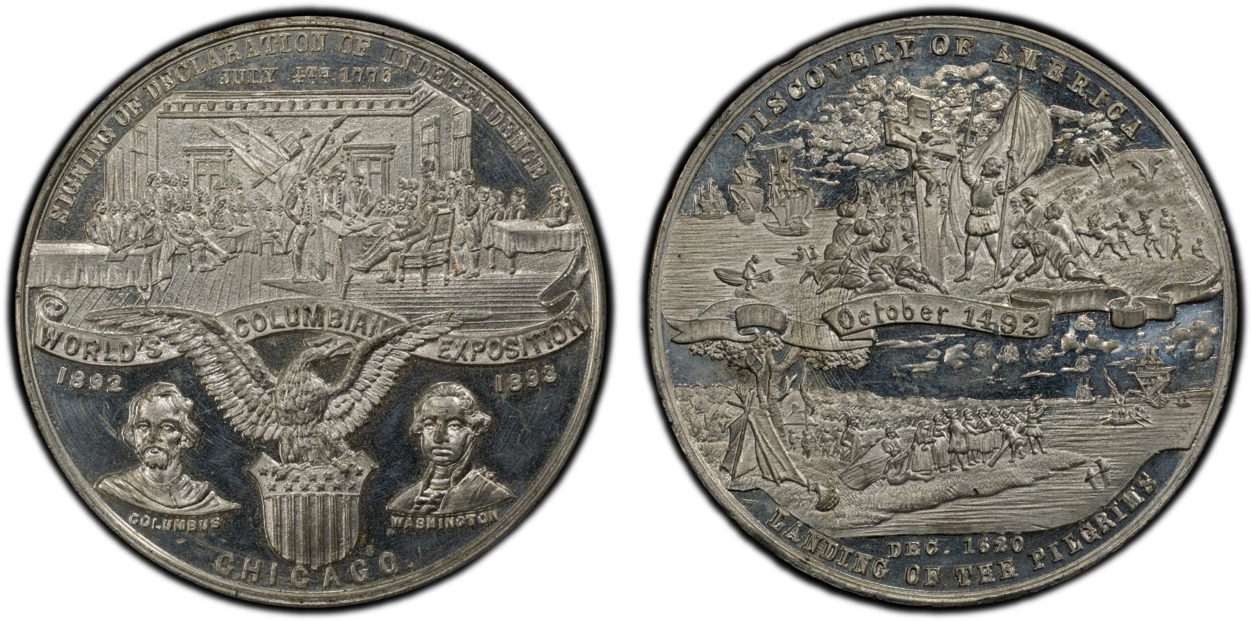 UNITED STATES: white metal medal, 1892, Eglit-36A, 59mm white metal medal for the World's Columbian Exposition by W. Boldenweck & Co., DISCOVERY OF AMERICA at top with Columbus, soldiers and natives admiring depiction of The Crucifixion, with three ships at upper left, and banner inscribed "October 1492" below, with scene of arrival of the Mayflower below all and DEC. 1620 / LANDING OF THE PILGRIMS at bottom // "SIGNING OF THE DECLARATION OF INDEPENDENCE / JULY 4th 1776" at top with signing scene below and outstretched eagle on stars and stripes shield with banner behind inscribed "WORLD'S - COLUMBIAN - EXPOSITION, 1892 - 1893" in field below, Columbus bust left and Washington bust right, both busts three-quarters, and CHICAGO. at bottom, slight bend, W. BOLDENWECK & CO. on edge, a wonderful lustrous specimen quality example! PCGS graded Specimen 64.