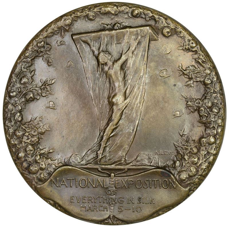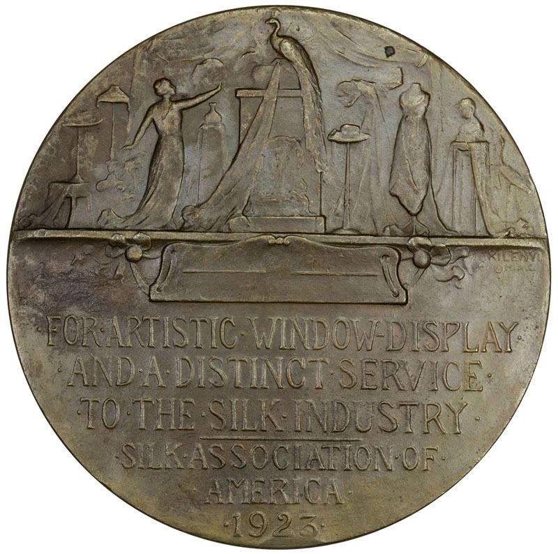 UNITED STATES:EF, 1923 AE medal, 63mm, lovely Art Nouveau medal by Hungarian-born American medalist Julio Kilenyi, NATIONAL EXPOSITION OF EVERTHING IN SILK, MARCH 5-10, nude female figure silhouetted behind silk curtain, silkworm moths flutter around, border of white mulberry studded with silkworm cocoons / FOR ARTISTIC WINDOW DISPLAY AND A DISTINCT SERVICE TO THE SILK INDUSTRY - SILK ASSOCIATION OF AMERICA, 1923, peacock on pedestal, woman in silk gown amongst various racks displaying silk wares, a gorgeous medal, R. This is the first of this medal type we have encountered.