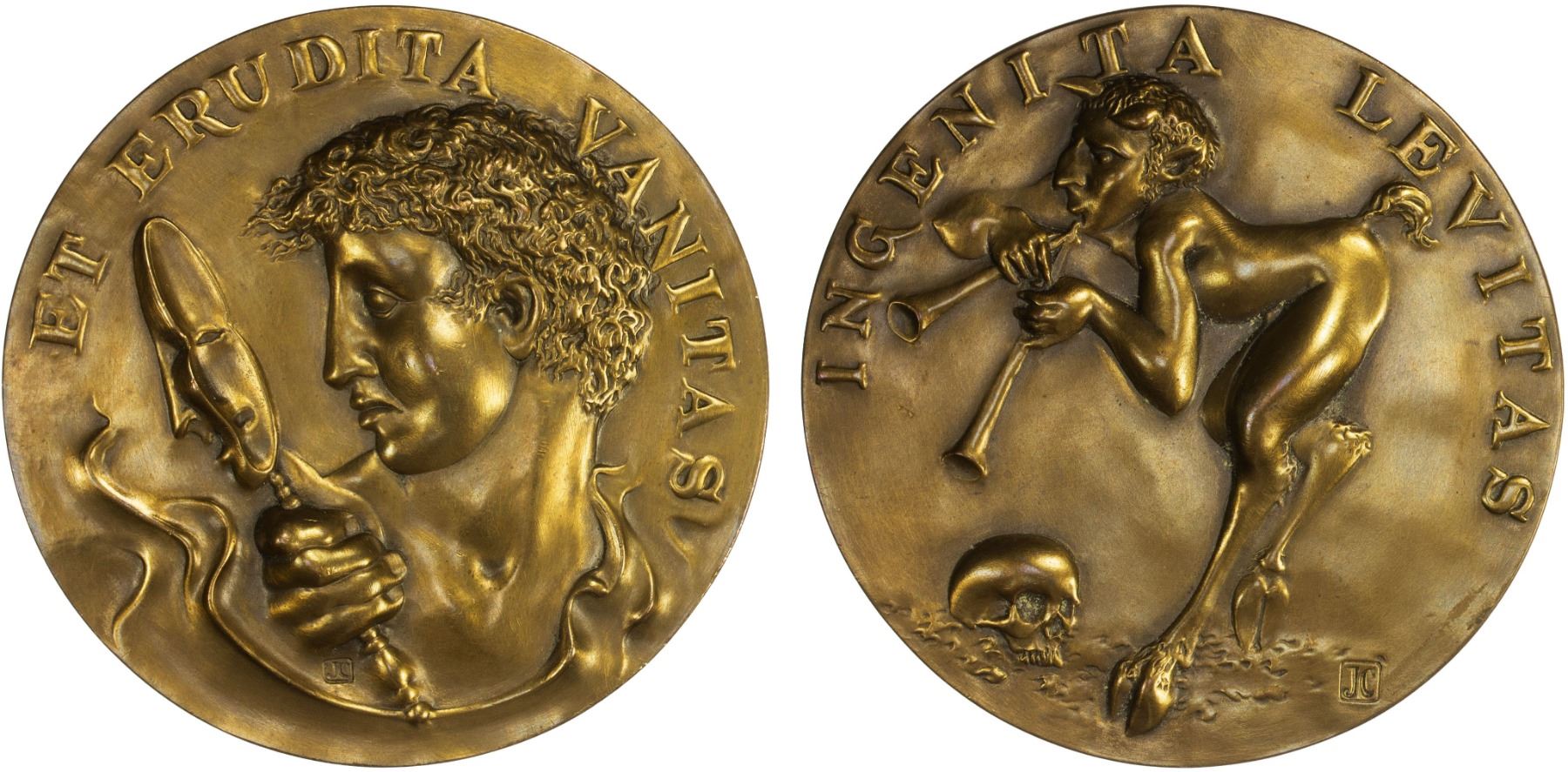 URUGUAY: AE medal (211.7g), ND (1982), 72mm bronze medal for the Society of Medalists, the 105th issue, "Vanity" by sculptor John Cook for Medallic Art Company, Danbury, CT, Pan playing pipes over a skull with INGENITA LEVITAS around // bust of male figure with head left holding a mask with ET ERUDITA VANITAS around, matte finish, plain edge, Unc.