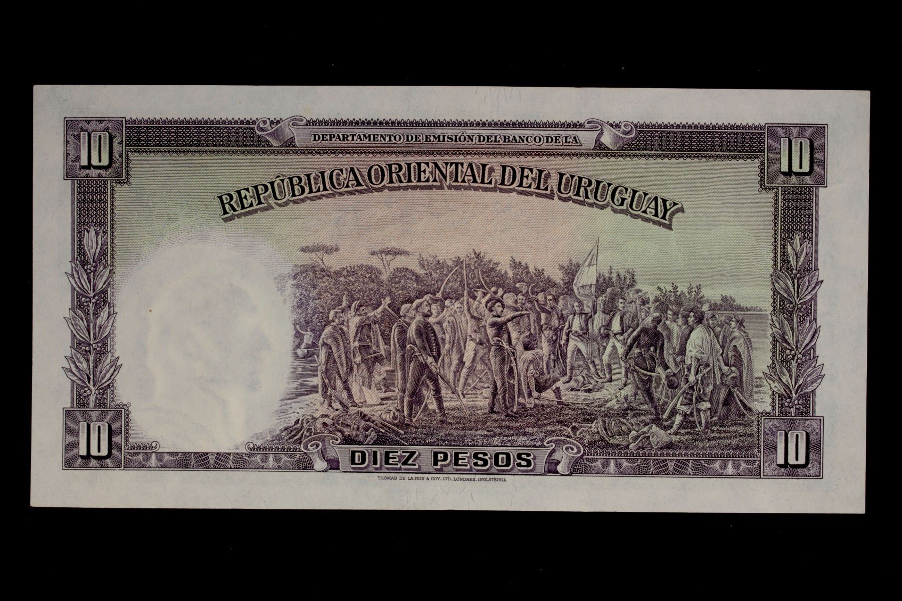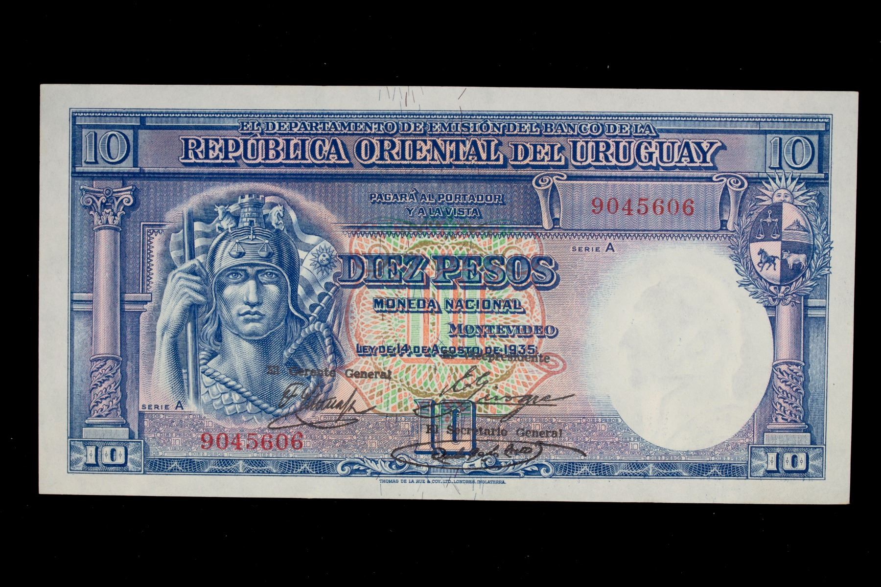 URUGUAY: Republic, 10 pesos, L. 1935, Pick-30b, deep blue on multicolored underprint, Choice AU.