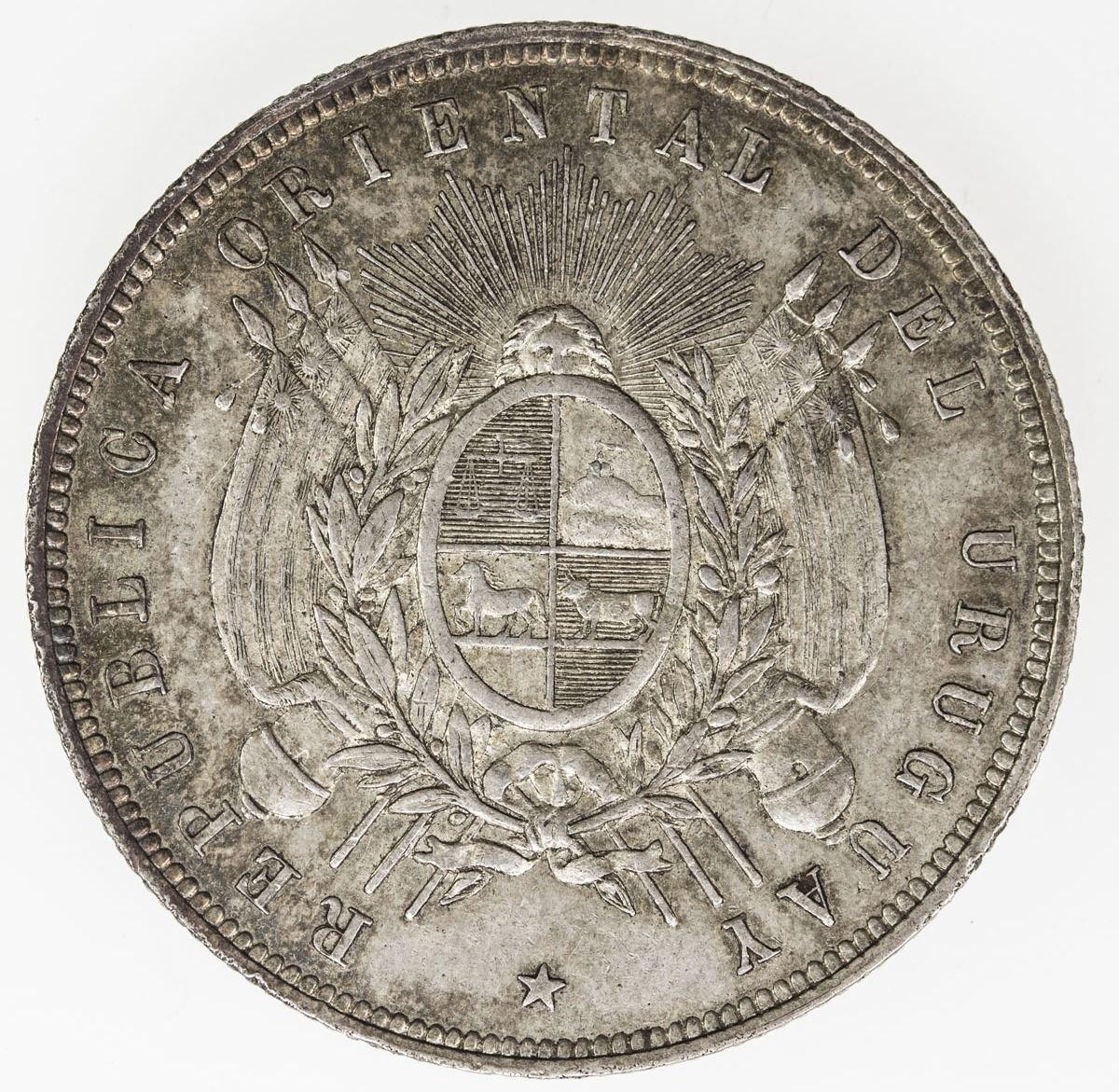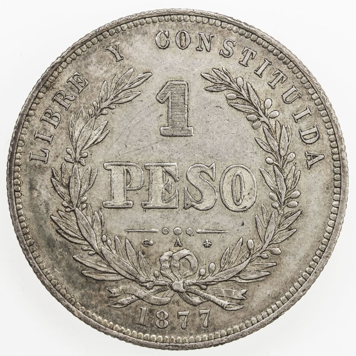 URUGUAY: Republic, AR peso, 1877-A, KM-17, attractive light tone, one-year type, Choice EF, ex Wolfgang Schuster Collection.
