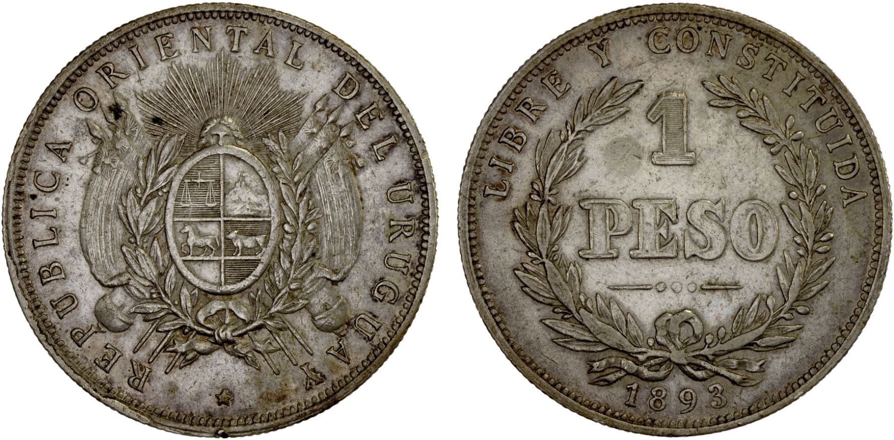 URUGUAY: Republic, AR peso, 1893, KM-17a, variety with round top 3, lightly cleaned, a few small obverse spots, tiny obverse rim nick, XF.