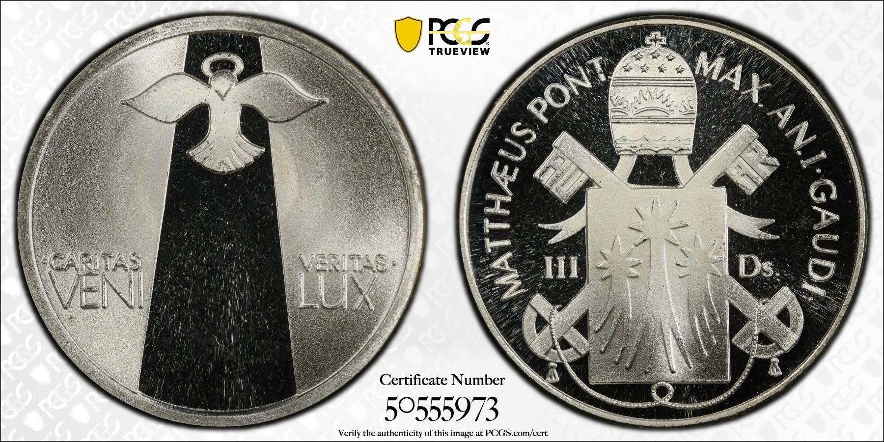 VATICAN: Mathew I, 1989, AR 3 ducati, year 1, KM-X21a, fantasy issue struck in silver, PCGS graded Proof 69 DCAM. Fantasy type struck by Fred Zinkann at the Mintmasters Coining private mint, Franklin Park, Illinois, USA.