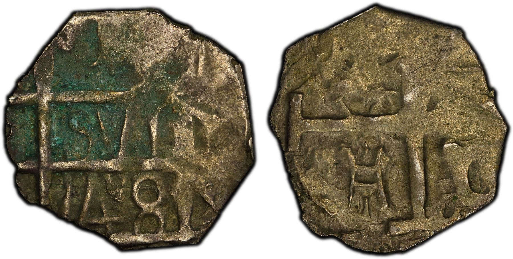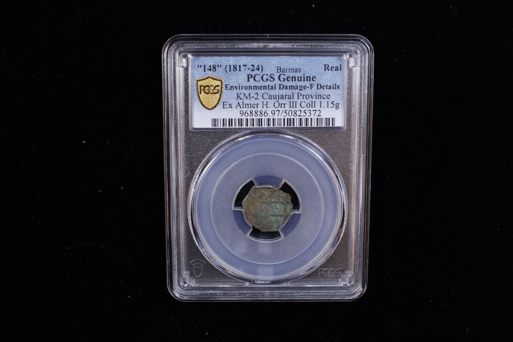 VENEZUELA: Barinas, Caujaral, AR "chipi-chipi" real (1.15g), "148" (1817-24), KM-2, visible date, environmental damage, PCGS graded Fine details, ex Almer H. Orr III Collection. An imitation of a Bolivian 1 real cob, derisively known as a "Chipi-Chipi", a Mexican word used to indicate little in size or a light rain.This imitation cob-type coin was minted from 1817 to 1824 by General José Antonio Páez in Southwest Venezuela in Caujaral, Barinas Province.