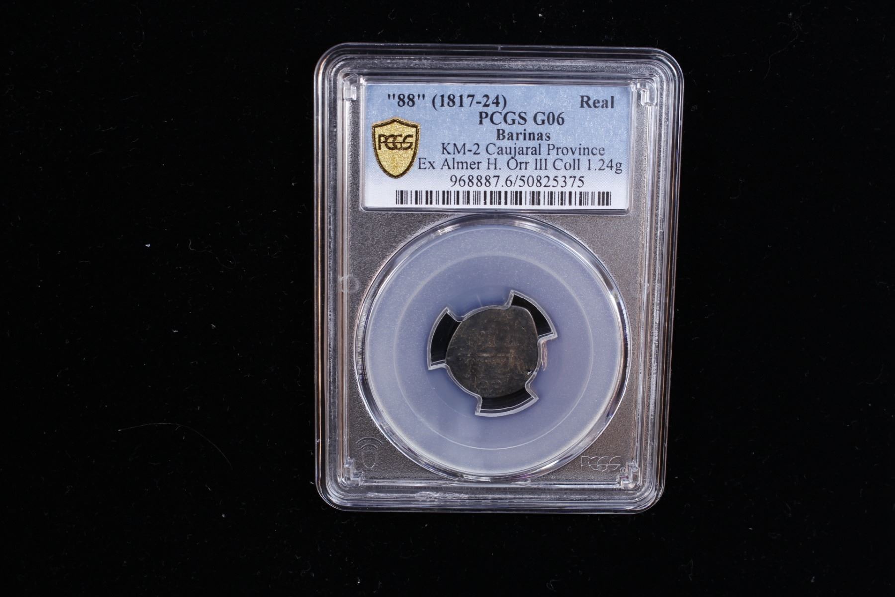VENEZUELA: Barinas, Caujaral, AR "chipi-chipi" real (1.24g), "88" (1817-24), KM-2, a pleasant historical example, PCGS graded G6, ex Almer H. Orr III Collection. An imitation of a Bolivian 1 Real cob, derisively known as a "Chipi-Chipi", a Mexican word used to indicate little in size or a light rain.