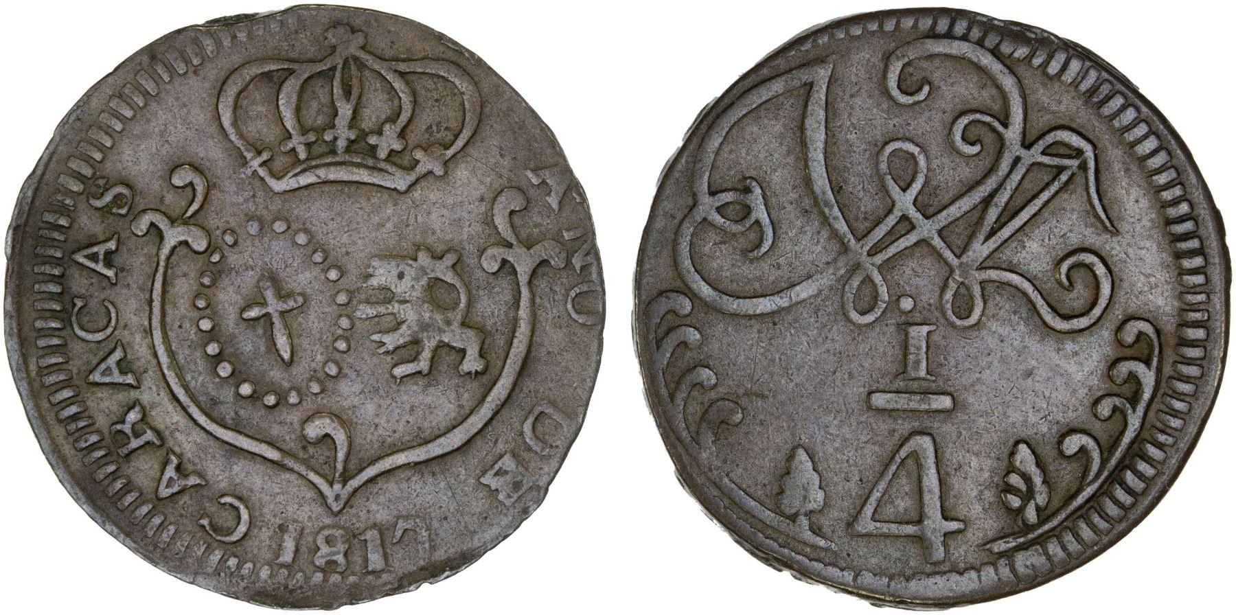 VENEZUELA: Caracas, AE 1/4 real, 1817, Cr-2, 22mm, small date variety, XF.