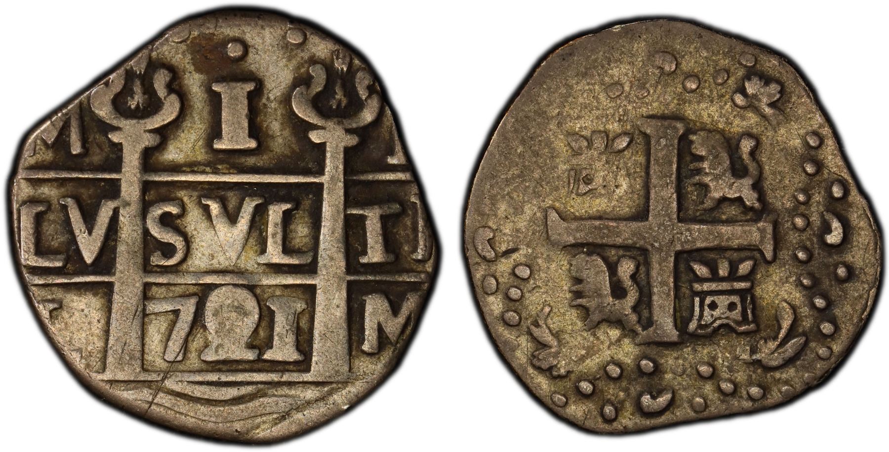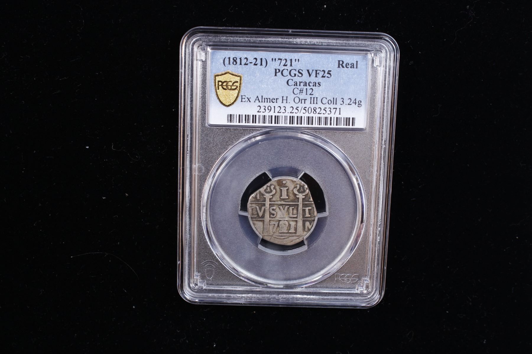 VENEZUELA: Caracas / Republican, AR real / macuquina (3.24g), "721" (1812-21), Cr-12, cob style, a well struck attractive example, PCGS graded VF25, ex Almer H. Orr III Collection. "Macuquina" coins are considered both Royalist and Republican; because of the nature of the coins, it is hard to determine which side the mint was on; or if they at some point changed alignments.