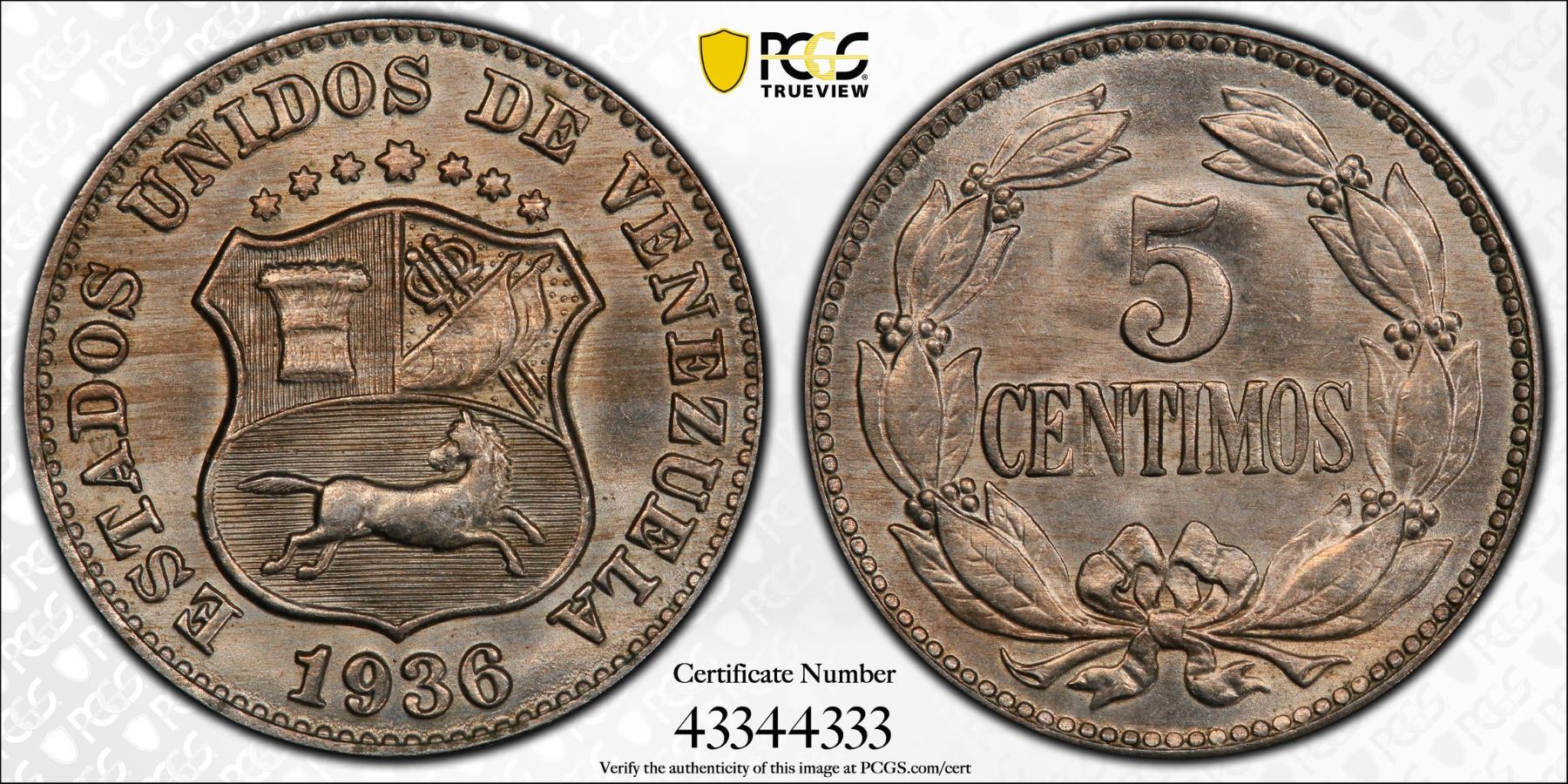 VENEZUELA: Republic, 5 centimos, 1936, Y-27, a superb quality example! PCGS graded MS65.