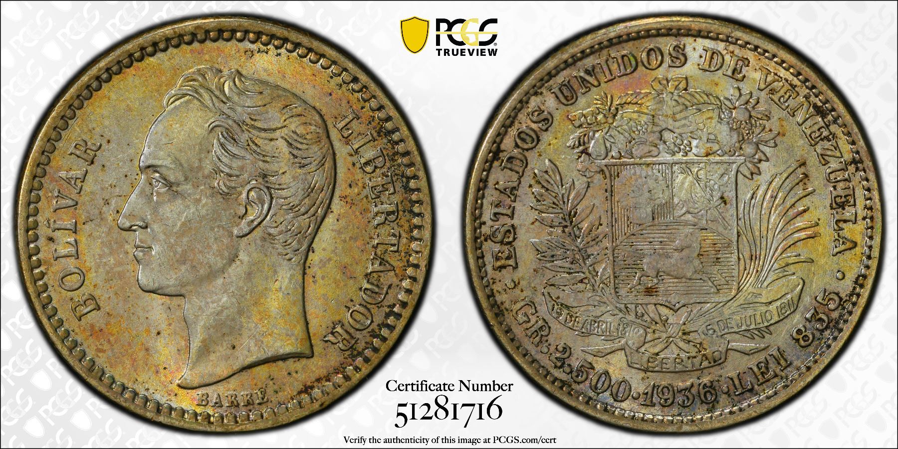 VENEZUELA: Republic, AR 1/2 bolivar, 1936, Y-21, a lovely mint state example! PCGS graded MS63.