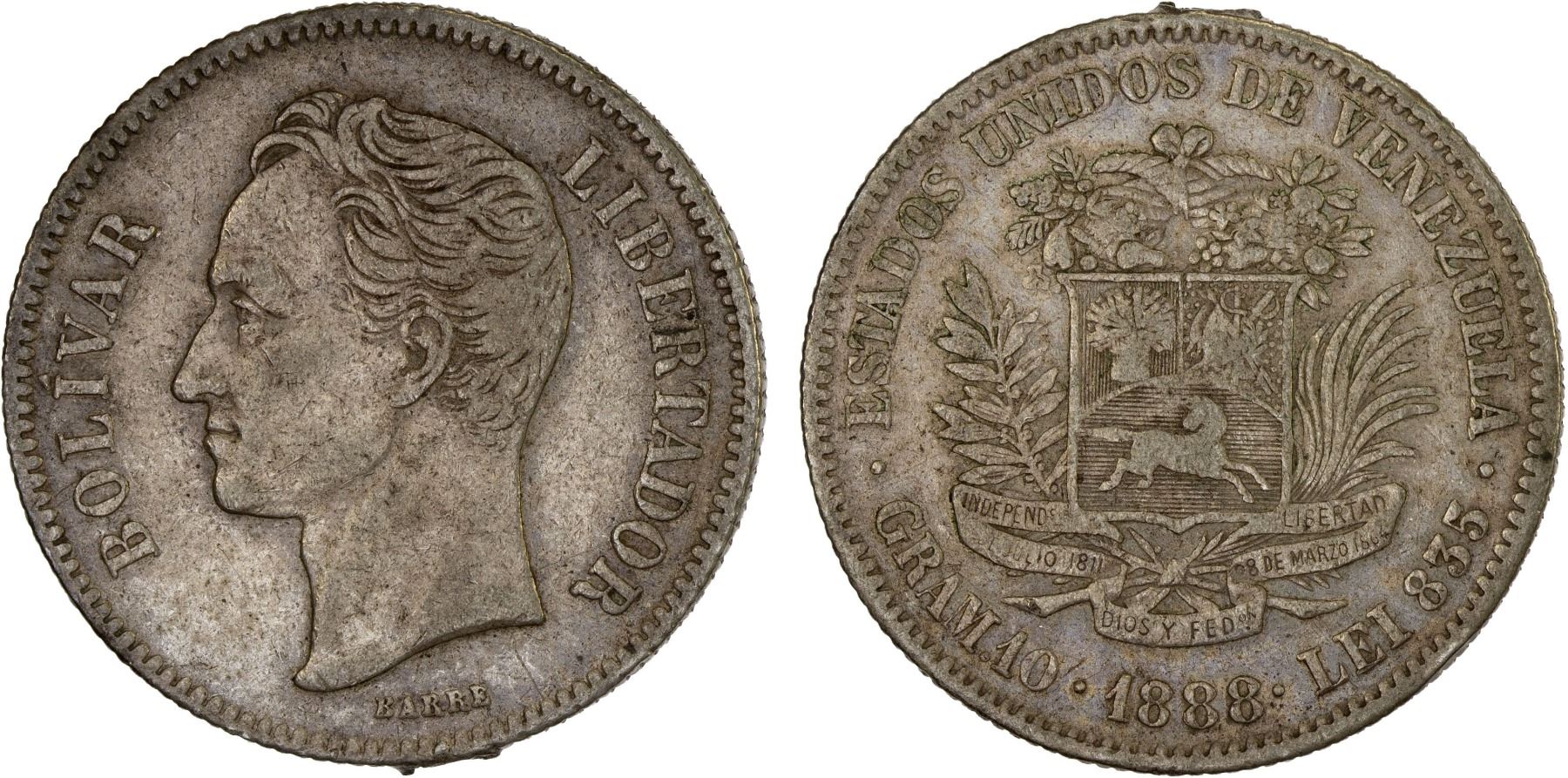 VENEZUELA: Republic, AR 2 bolivares, 1888, Y-23, ex-mount, rare date, VF.
