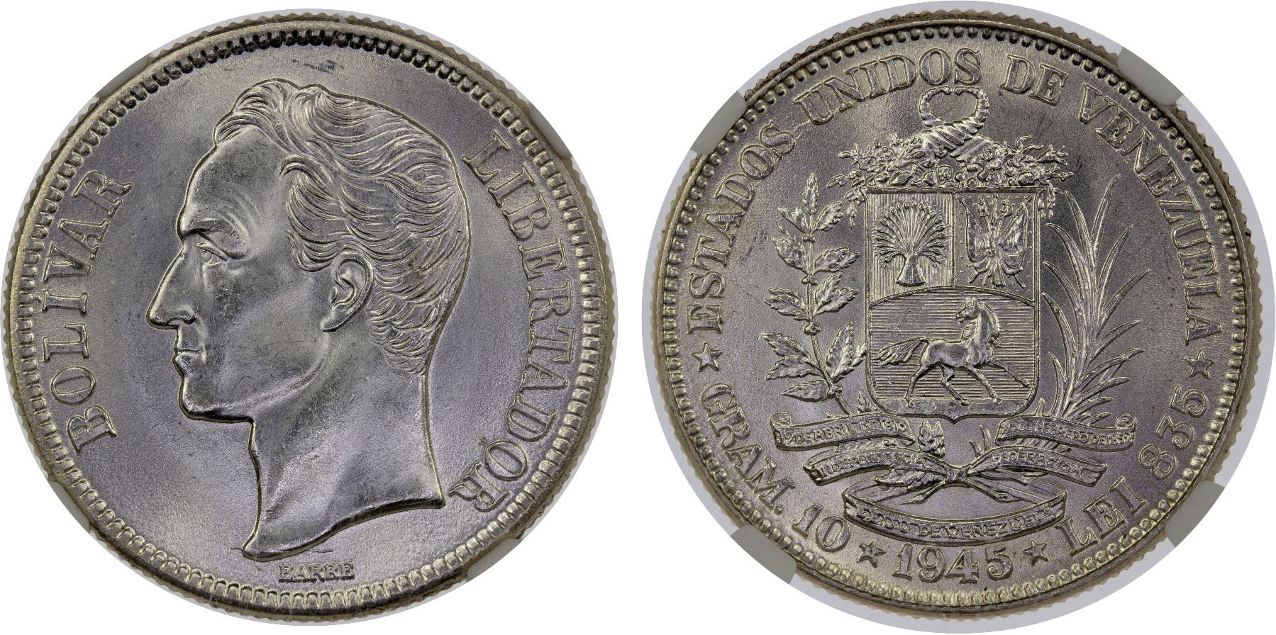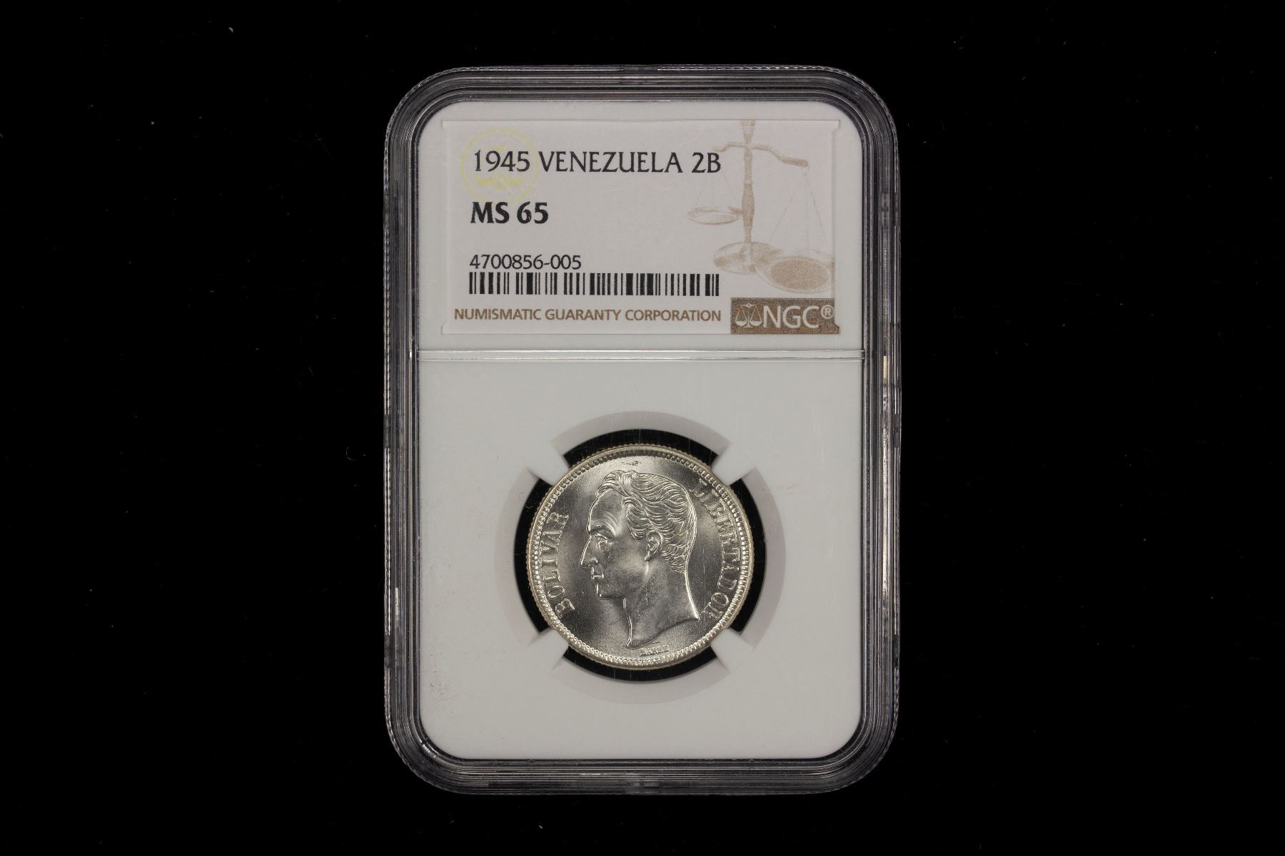 VENEZUELA: Republic, AR 2 bolivares, 1945, Y-23a, a superb mint state example! NGC graded MS65.