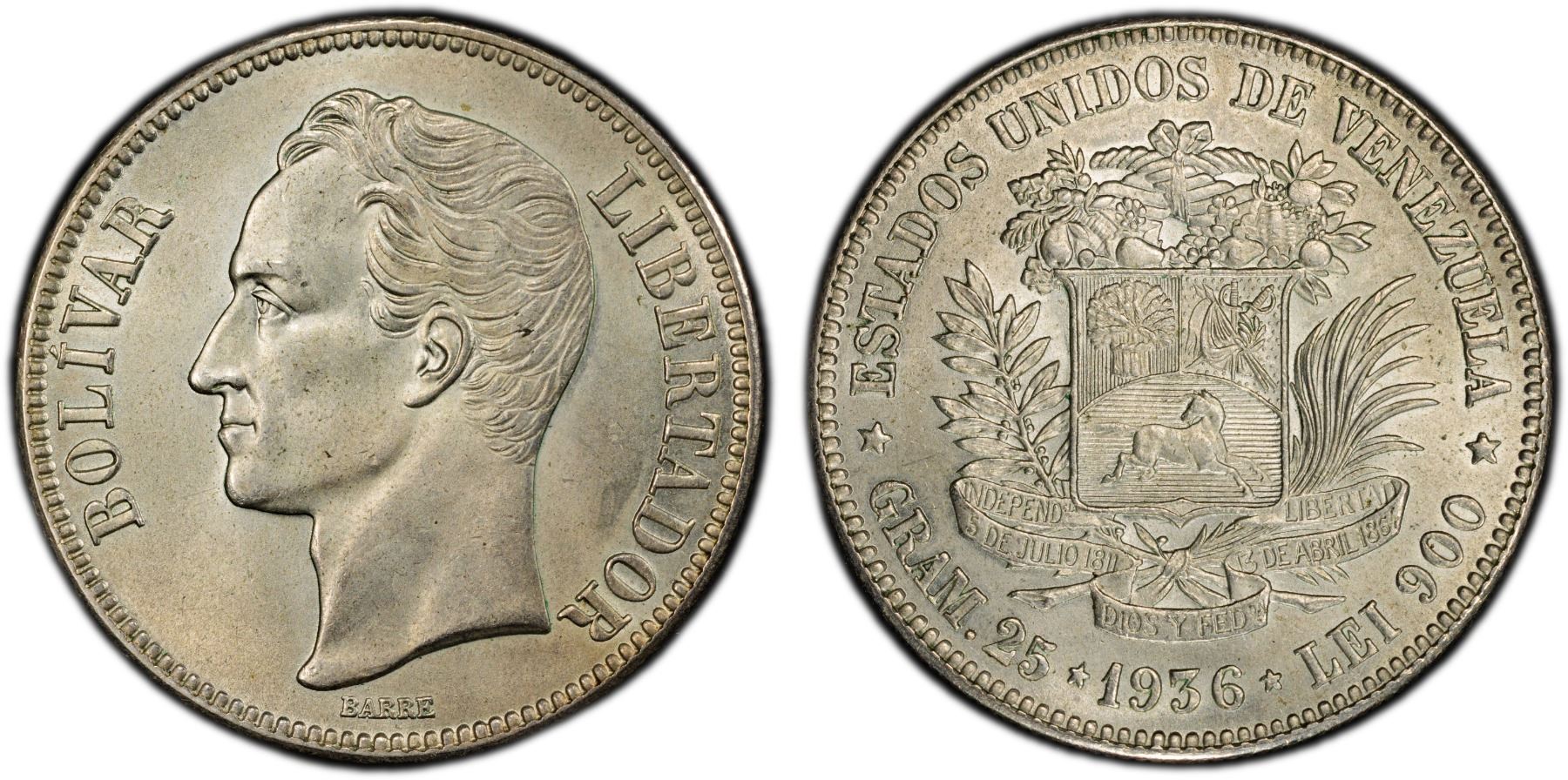 VENEZUELA: Republic, AR 5 bolivares, 1936, Y-24.2, struck at the United States Mint, Philadelphia, aligned three, normal date type, a superb mint state example! PCGS graded MS65.