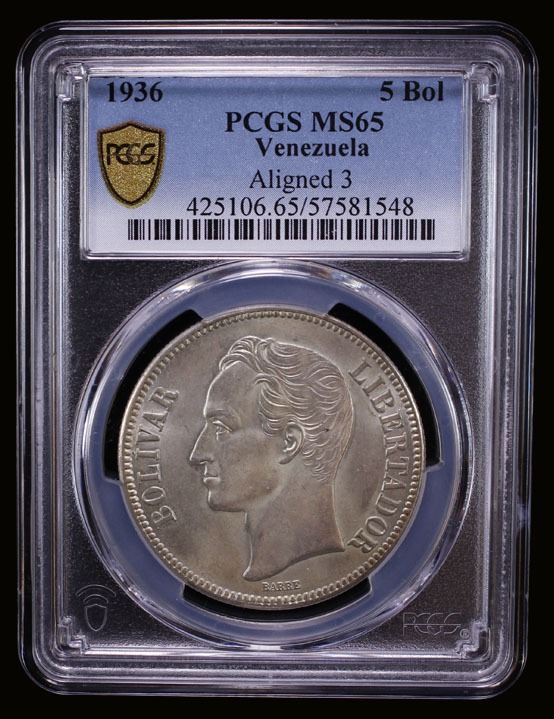 VENEZUELA: Republic, AR 5 bolivares, 1936, PCGS MS65