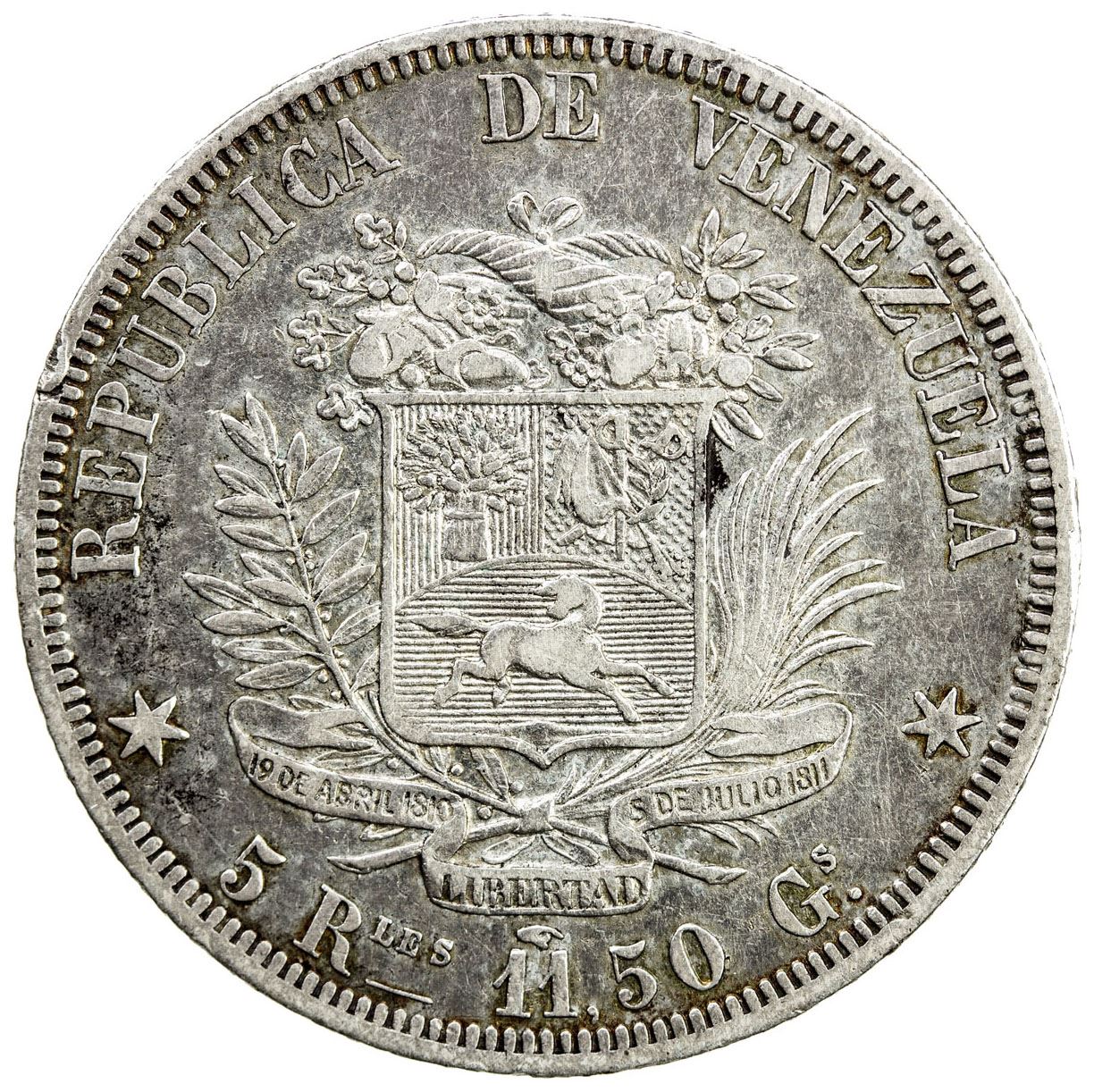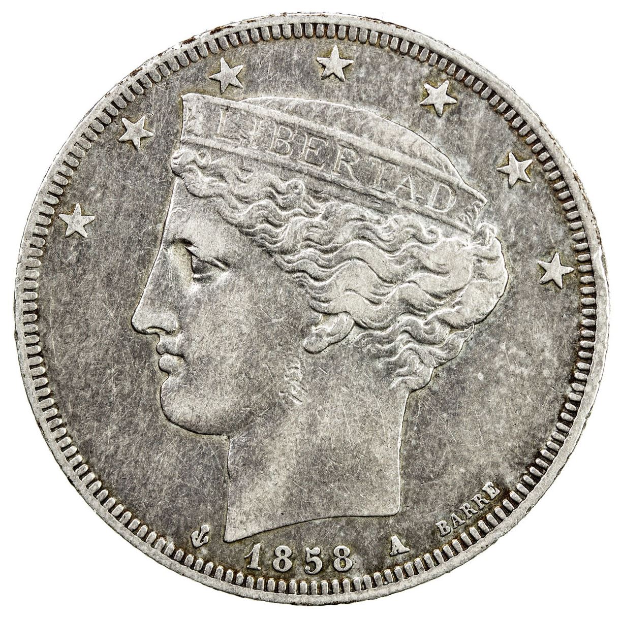 VENEZUELA: Republic, AR 5 reales, 1858-A, Y-11, tiny obverse rim nick, very rare one-year type, Choice VF, RR.