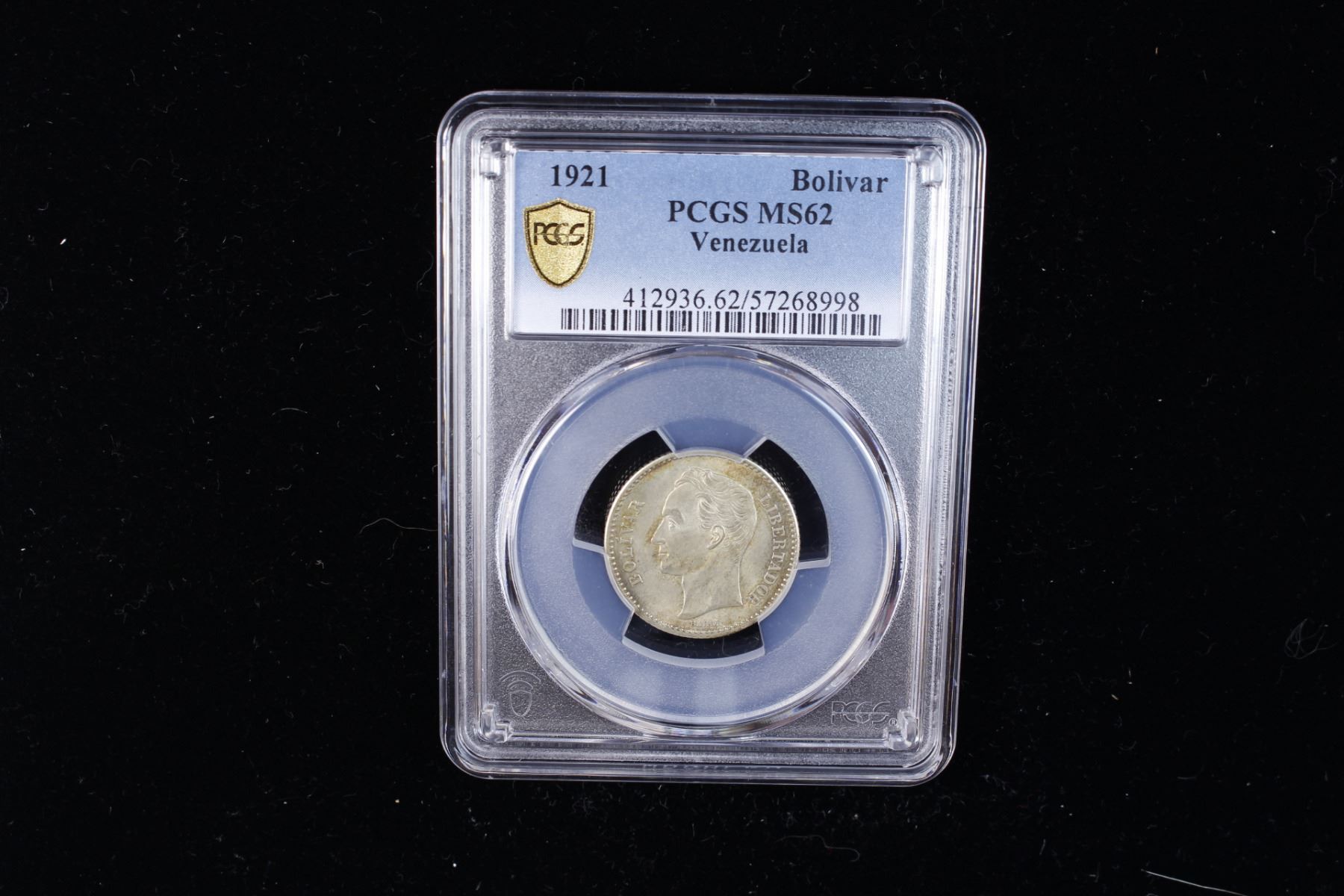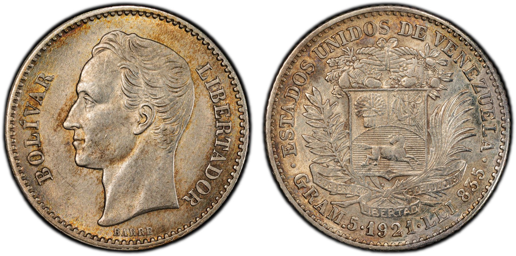 VENEZUELA: Republic, AR bolivar, 1921, Y-22, struck at the United States Mint, Philadelphia, a pleasing mint state example, PCGS graded MS62.