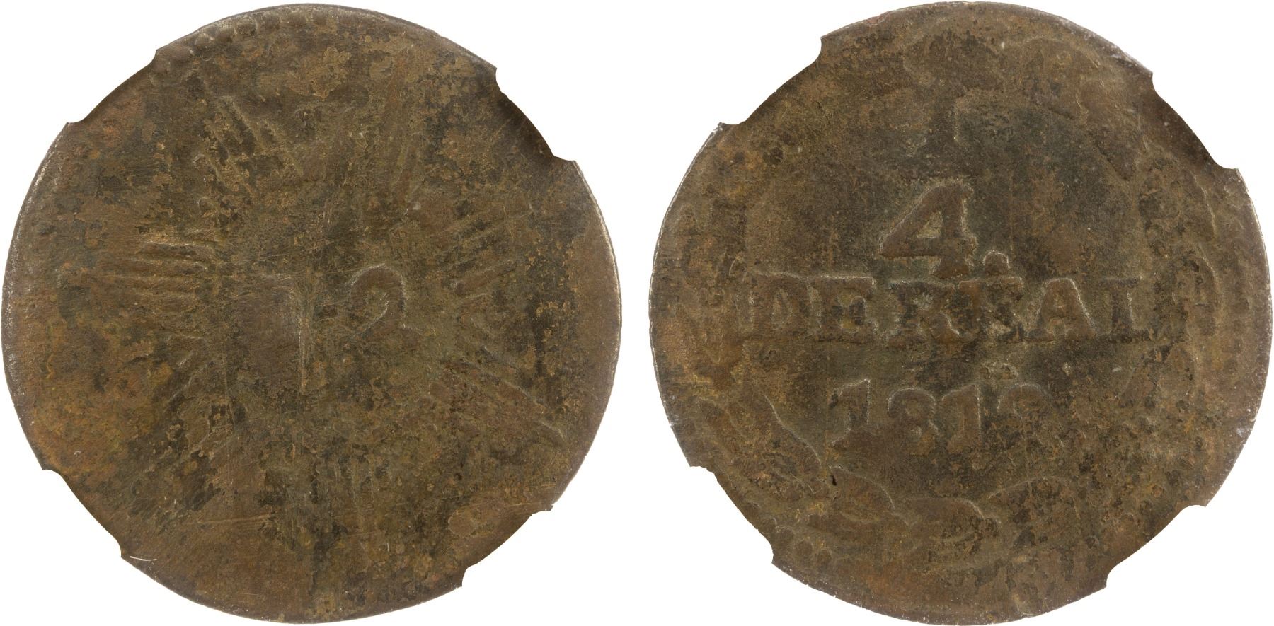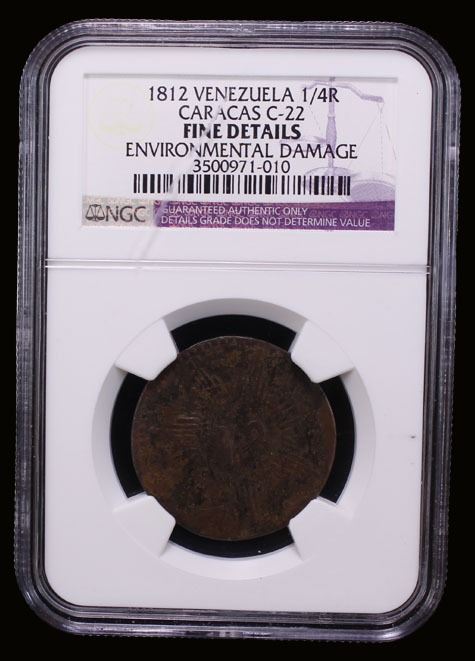 VENEZUELA: War of Independence, AE 1/4 real, Caracas, 1812, Cr-22, Republican issue, environmental damage, NGC graded Fine details.