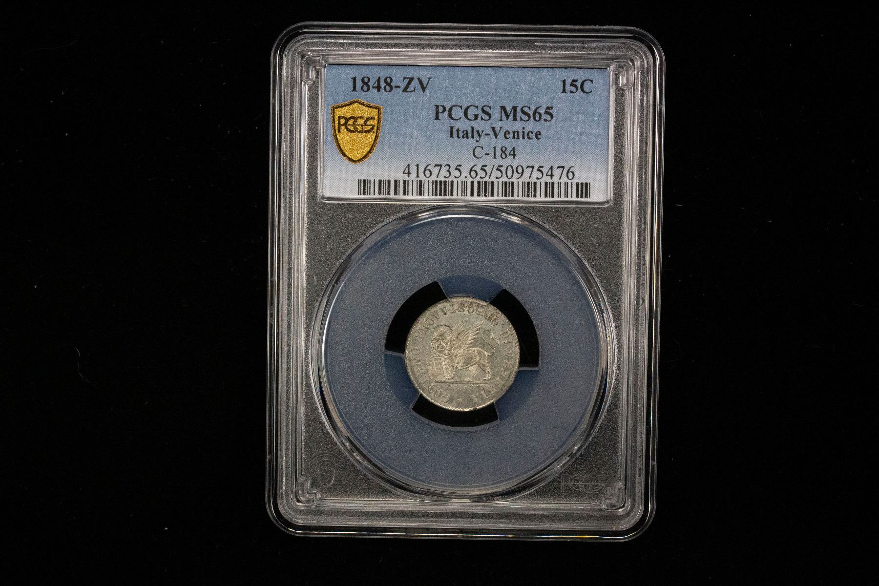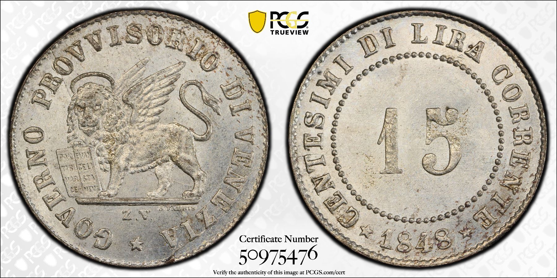 VENICE: Republic, BI 15 centesimi, 1849, KM-801, mint master initials ZV, a superb mint state example! PCGS graded MS65. The Republic of San Marco or the Venetian Republic was an Italian revolutionary state which existed for 17 months in 1848–1849.
