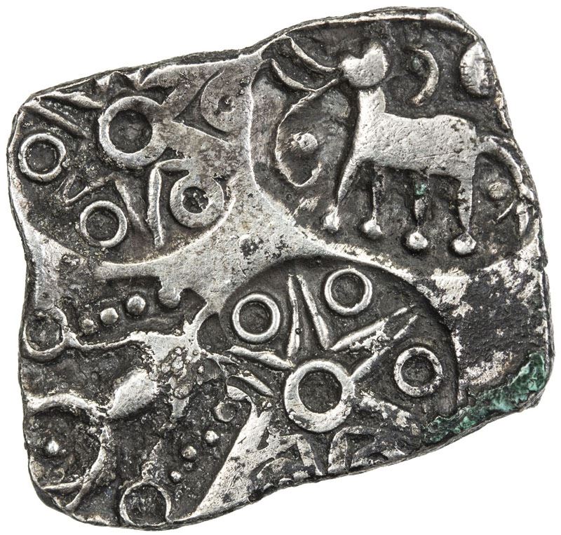 VIDARBHA: Punchmarked, ca. 500-400 BC, AR ½ karshapana (1.58g), from the Vainganga Valley, elephant with double crescent above, ornate taurine and a pair of six-ray stars, counter-struck on unidentified host, choice VF to EF.