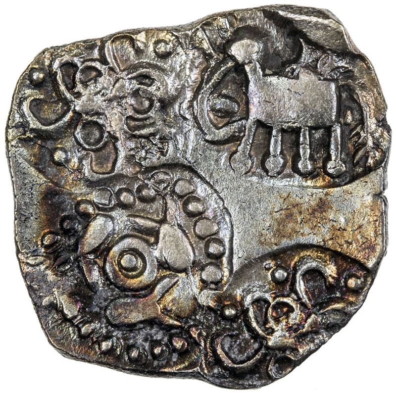 VIDARBHA: Punchmarked, ca. 500-400 BC, AR ½ karshapana (1.69g), from Vainanga Valley, including elephant with double crescent above, annulet surrounded by taurines and a pair of geometric design, nicely toned, unpublished variety, EF.