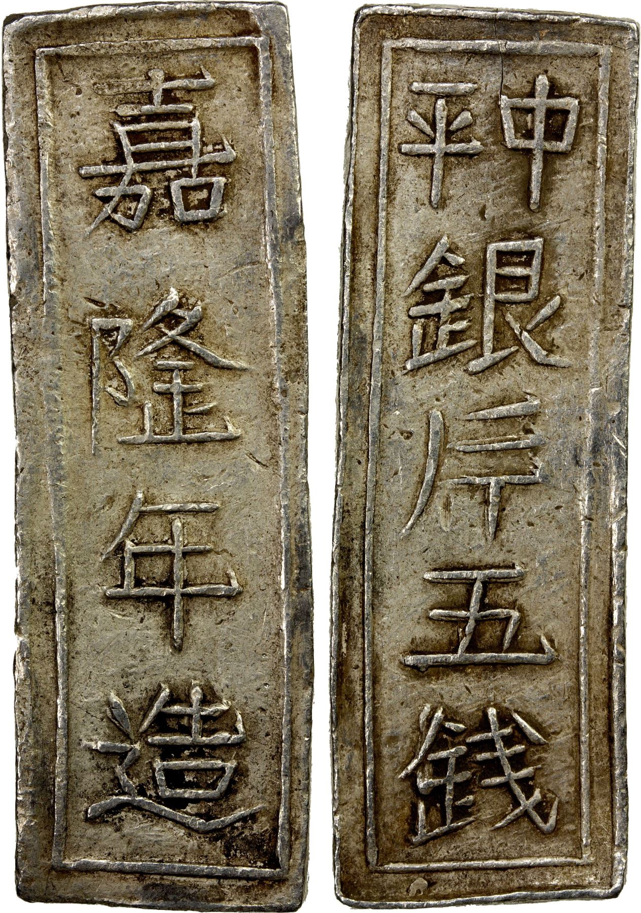 VIET NAM (NGUYEN DYNASTY): Gia Long, 1802-1820, AR 5 tien (19.25g), Sch-122, in Hán Nôm characters, gia long nien tao (made in the Gia Long era) // trung binh / ngan phien ngu tien (Trung Binh [scale] fine silver five mace), VF-EF.