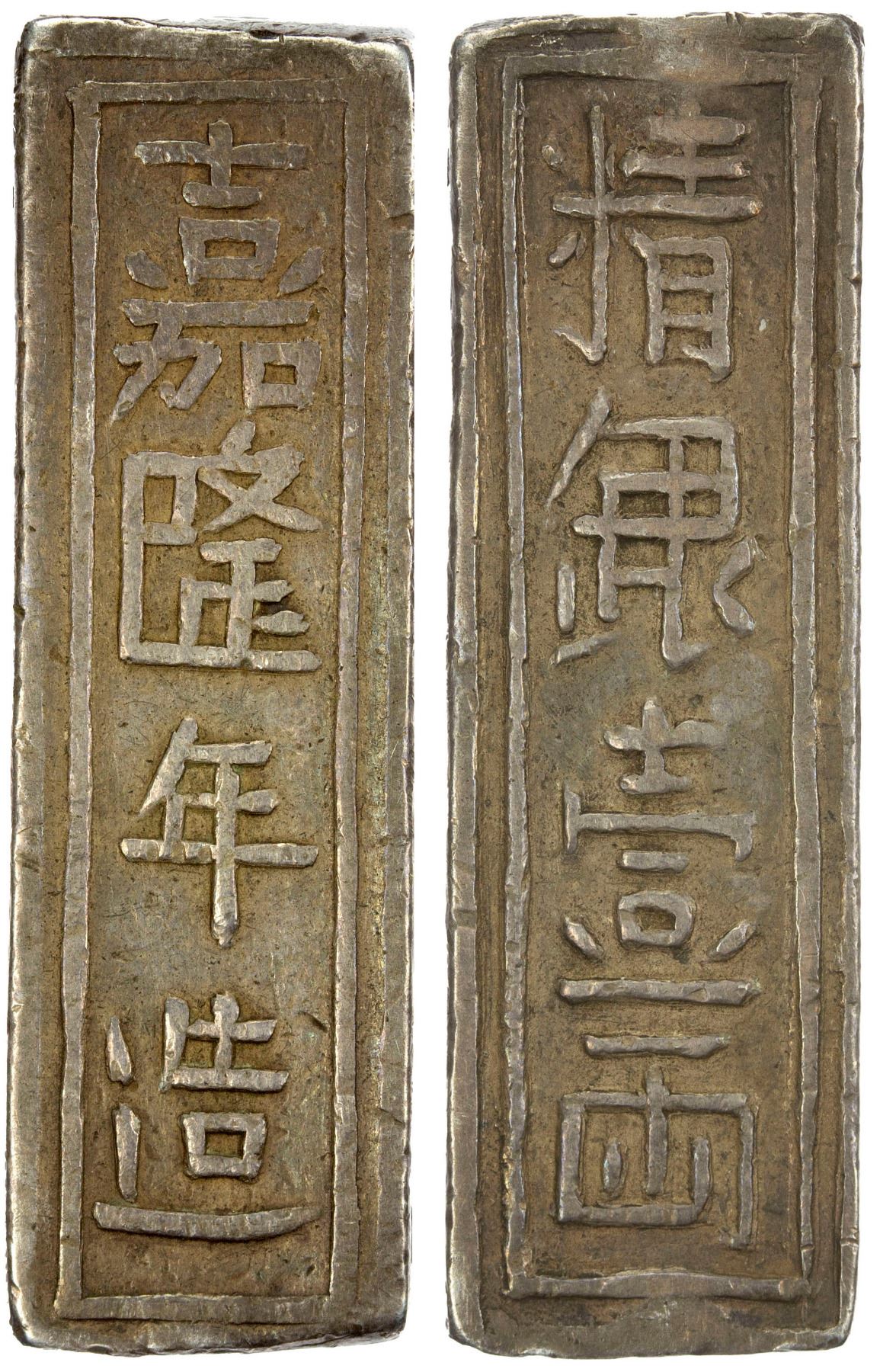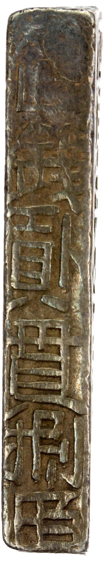 VIETNAM: Later Issues (style of Gia Long, 1802-1820), AR lang (37.77g), KM-179, Sch-18, Gia Long nien tao (made in He Gia Long Era) // tinh ngan nhat lang (pure silver one lang [liang]), trung binh hieu (made on the Trung Binh scale) on left edge and tri tien nhi quan bat mach (monetary value of 2 ligatures 8/1-) on right edge.