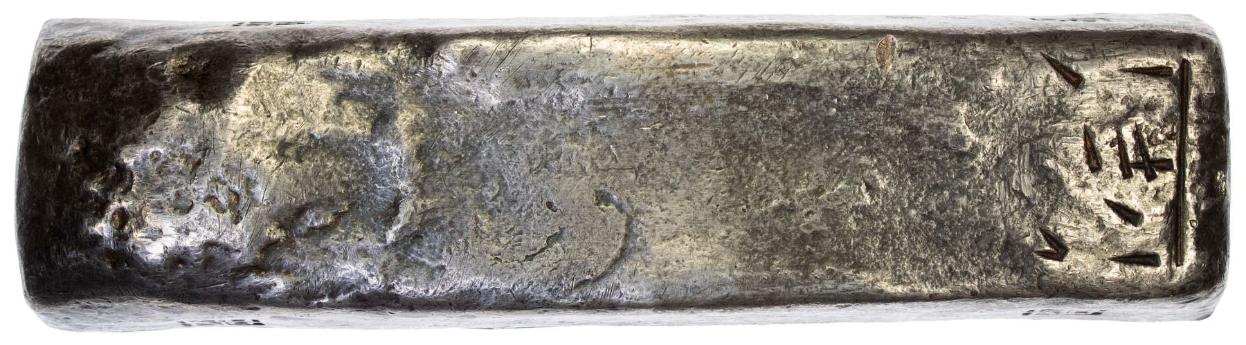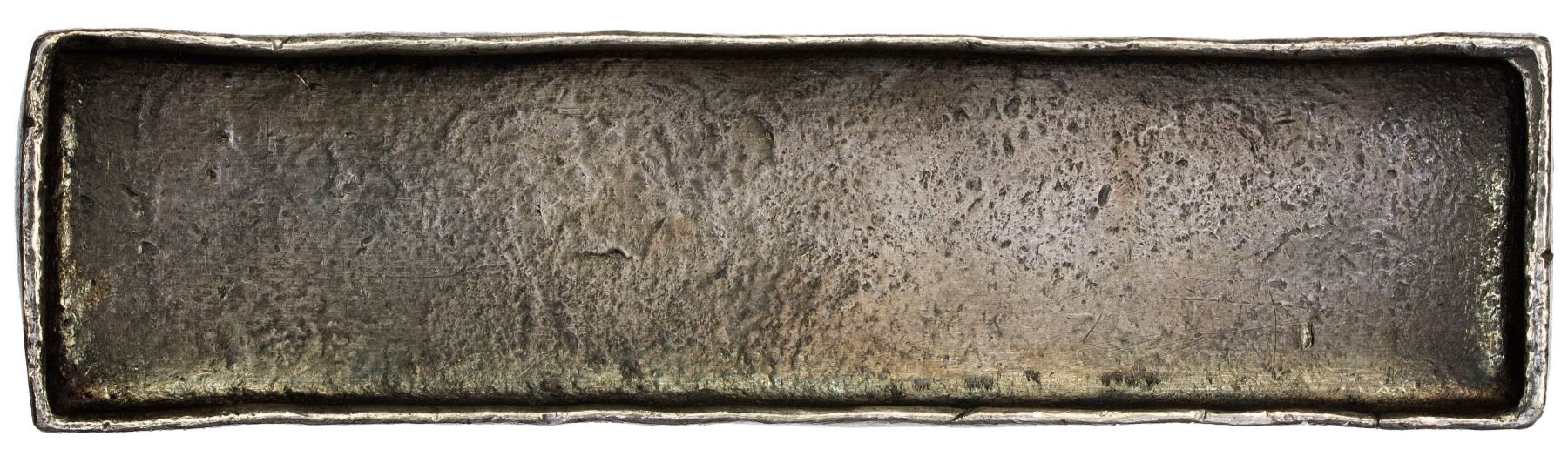 NGUYEN DYNASTY (ANNAM): Bullion Series, AR 10 lang (382.92g), ca. late 19th century, 110mm-long curved rectangular silver bar, with several assayer stamps on the sides and etched assayer marking on reverse, VF, ex SARC Auction 37, Lot 1781. Known as "nen bac" in Vietnamese, these silver bars were made from various silver coins that circulated in the region and has a consistent fineness of .991.