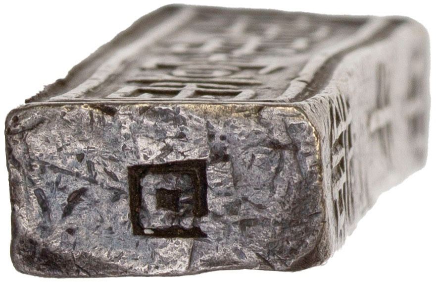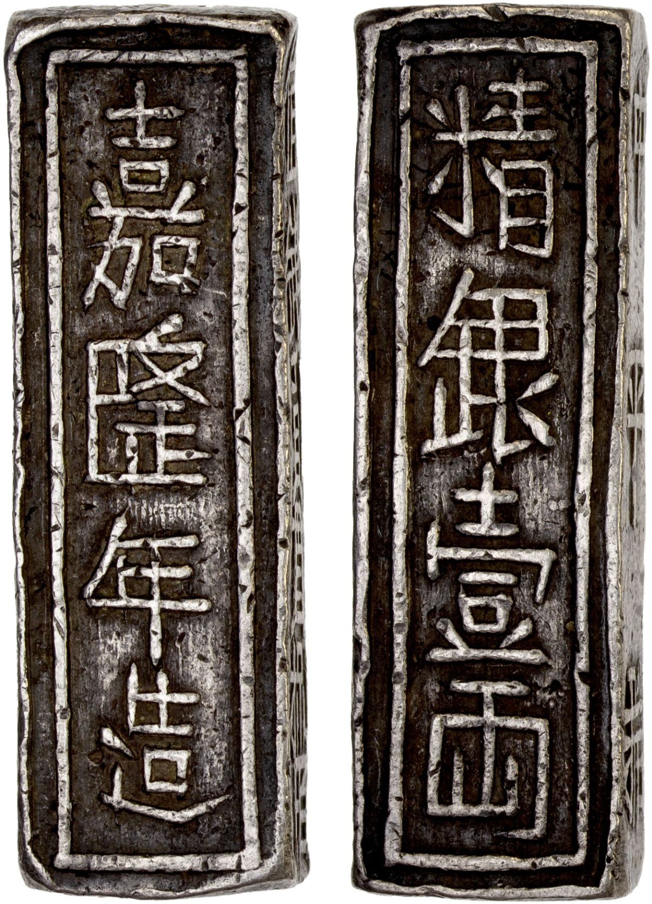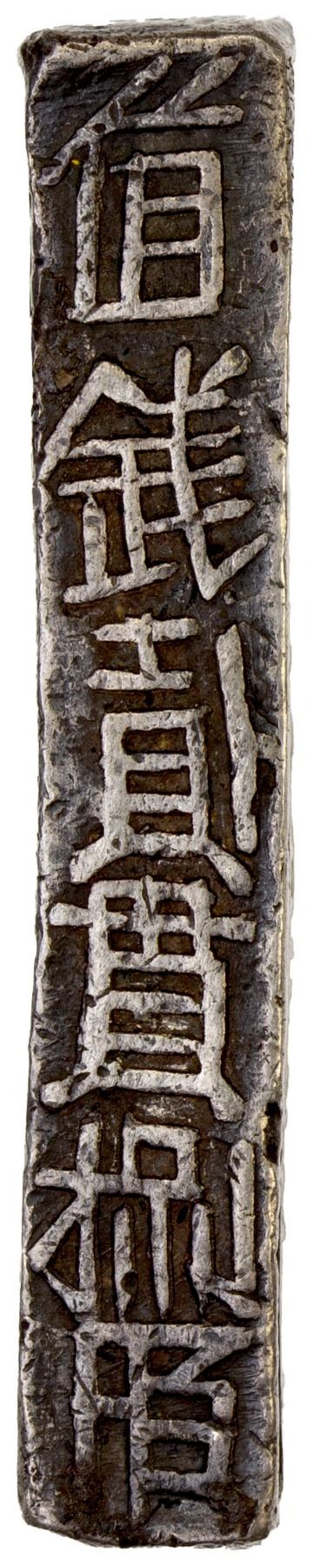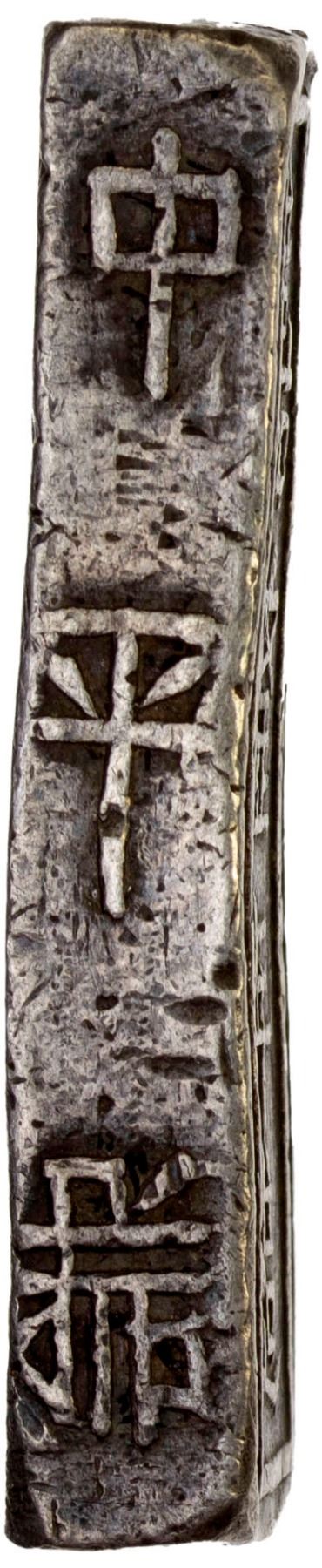 VIETNAM / VIET NAM (NGUYEN DYNASTY): Bullion Series, AR lang (38.61g), KM-118, in Hán Nôm characters, gia long nien tao ("made in the Gia Long era") // tinh ngan nhat lang ("pure silver one lang [liang]"), trung binh hieu ("Trung Binh scale") on left edge and tri tien nhi quan bat mach ("worth two strings and 800 [cash]") on right edge, crude calligraphy, slightly wavy flan, VF-XF. This type was made with many different dies until the early 20th century as a popular form of bullion for use in Indochina.