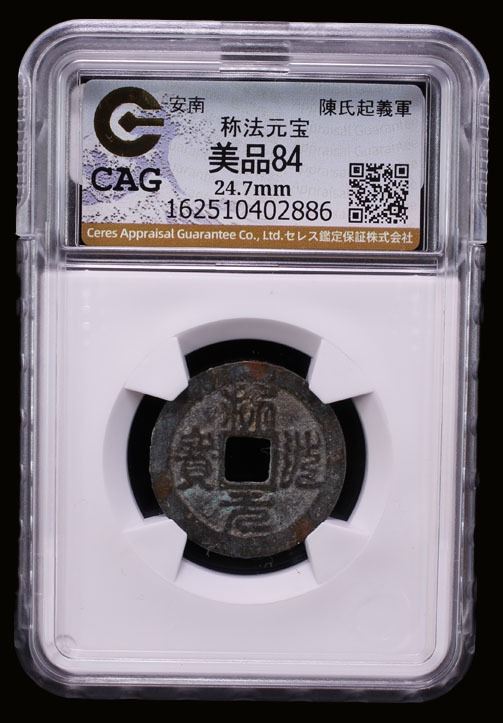VIETNAMESE DYNASTIES: Xung Phap, AE van, H-2.13, Miura Gosen p.10, cf. Zeno-106706, unofficial issue by the rebel Tran Cao (ca. 1516-21), xung phap nguyen bao in stylized seal script, graded 84 by CAG Grading Company, VF.