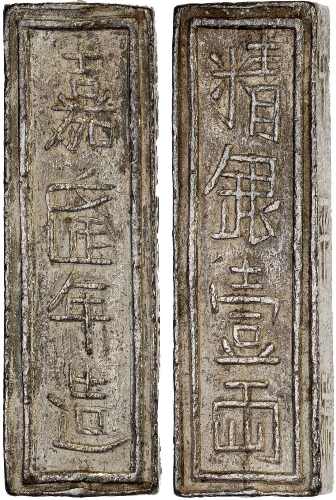 VIETNAM (Viet Nam / Annam): Nguyen Dynasty: Bullion Series, AR lang (38.42g), KM-118, in Hán Nôm characters, gia long nien tao ("made in the Gia Long era") // tinh ngan nhat lang ("pure silver one lang [liang]"), trung binh hieu ("Trung Binh scale") on left edge and tri tien nhi quan bat mach ("worth two strings and 800 [cash]") on right edge, crude calligraphy, VF-XF. This type was made with many different dies until the early 20th century as a popular form of bullion for use in Indochina.