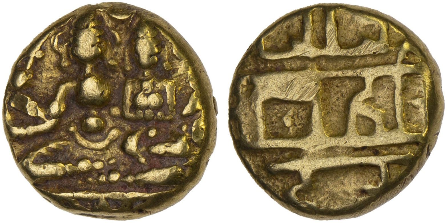 VIJAYANAGAR: Devaraja I, 1406-1422, AV 1/2 pagoda (1.67g), Mitch-, Zeno-254628, Siva & Parvati seated, Siva holding antelope head & damaru, XF. Also struck without type change by Devaraya II (1423-1446).
