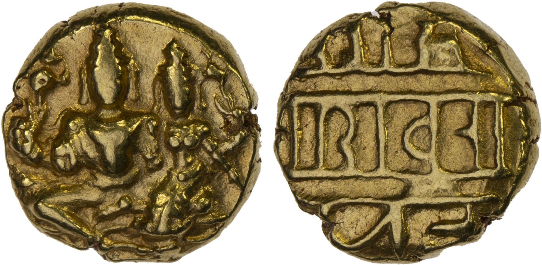 VIJAYANAGAR: Devaraja I, 1406-1422, AV pagoda (3.41g), Mitch-450, Zeno-254630, Siva & Parvati seated, Siva holding antelope head & damaru, later issue, with stylized version of the Devanagari calligraphy naming Devaraja, XF.