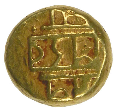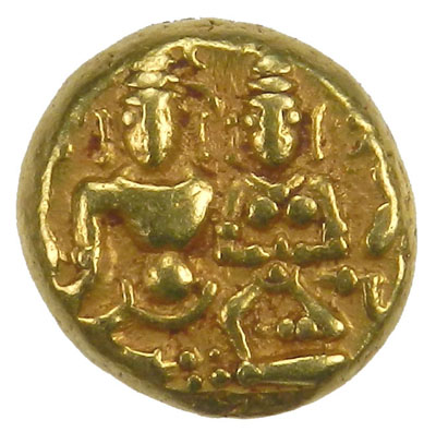 VIJAYANAGAR: Devaraya I or II, 1406-1446, AV pagoda (3.38g), Mitch-450, Siva & Parvati seated, with antelope head & damaru, pratapa misspelled as patapra, with pellet below the final "pra" and another pellet in bottom right corner, Very Fine.