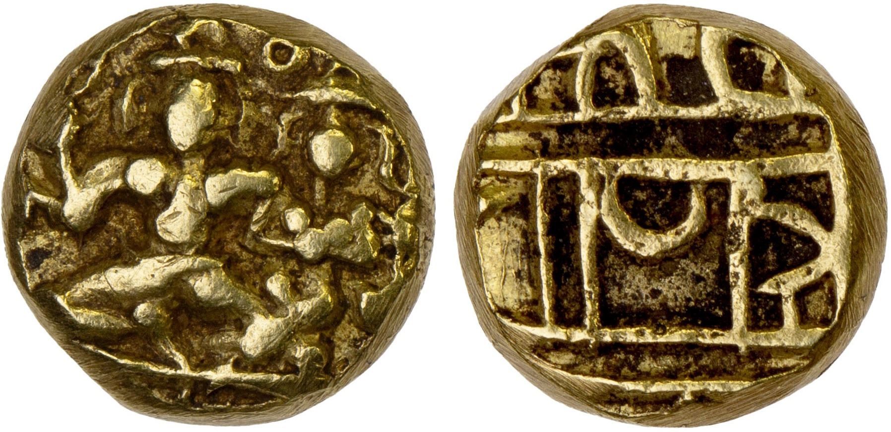 VIJAYANAGAR: Hari Hara II, 1377-1404, AV 1/2 pagoda (1.60g), Mitch-414, Vishnu & Lakshmi seated, Vishnu holding conch & discus; later imitation, VF.
