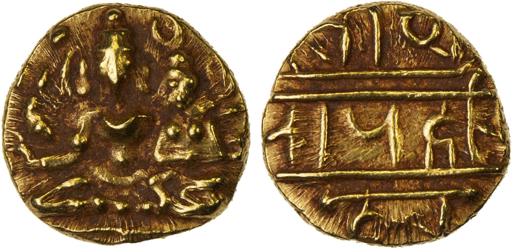 VIJAYANAGAR: Hari Hara II, 1377-1404, AV 1/2 pagoda (1.71g), Mitch-412, Siva & Parvati seated, Siva holding trident & damaru, XF.