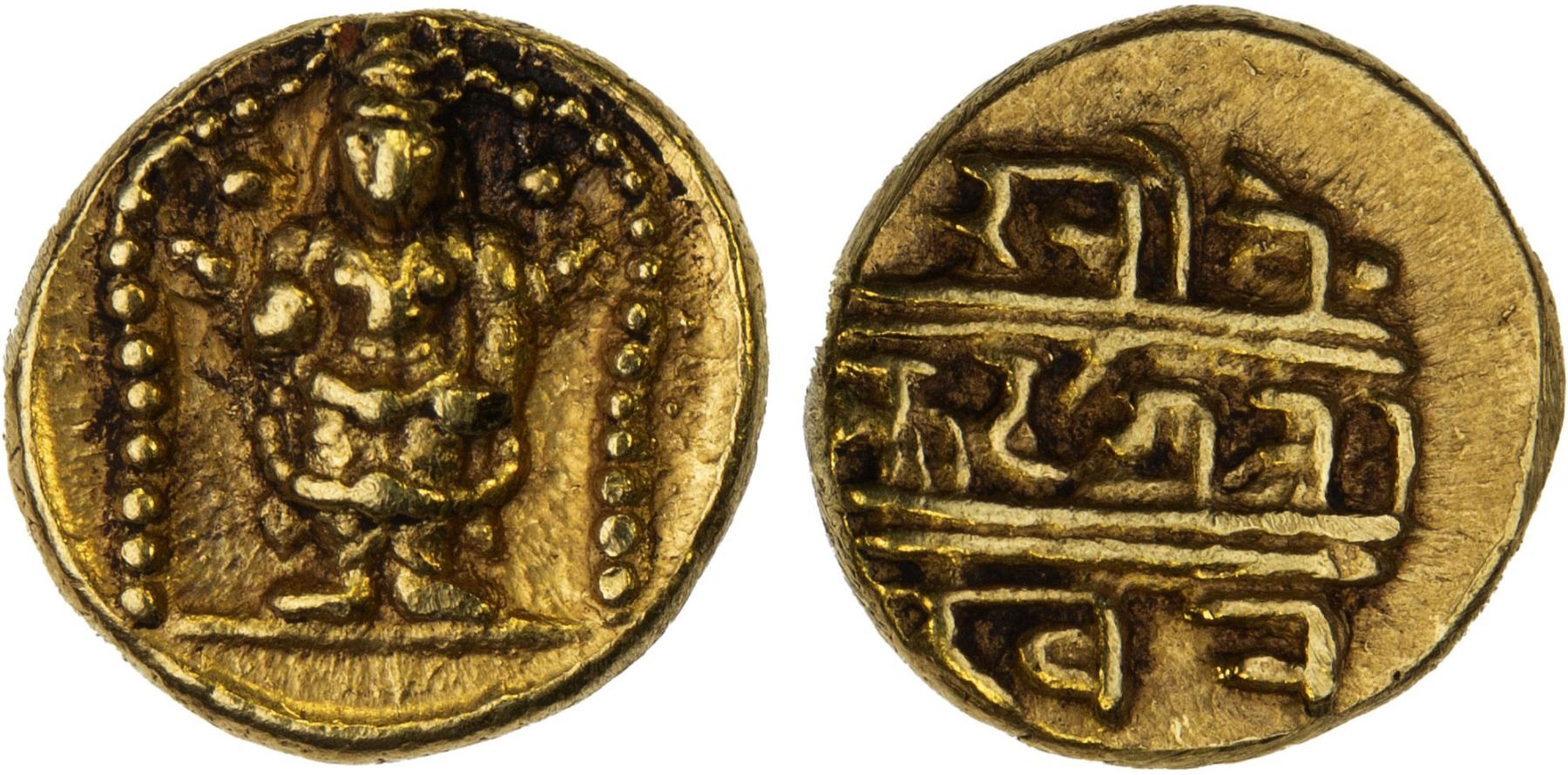 VIJAYANAGAR: Ventakapiraya, ca. 1630-1641, AV 1/2 pagoda (1.70g), Venkateshwara standing under an arch // stylized Nagari legend; assigned by Mitchiner to the region of Chandragiri in Andhra Pradesh; bold strike, XF, R.