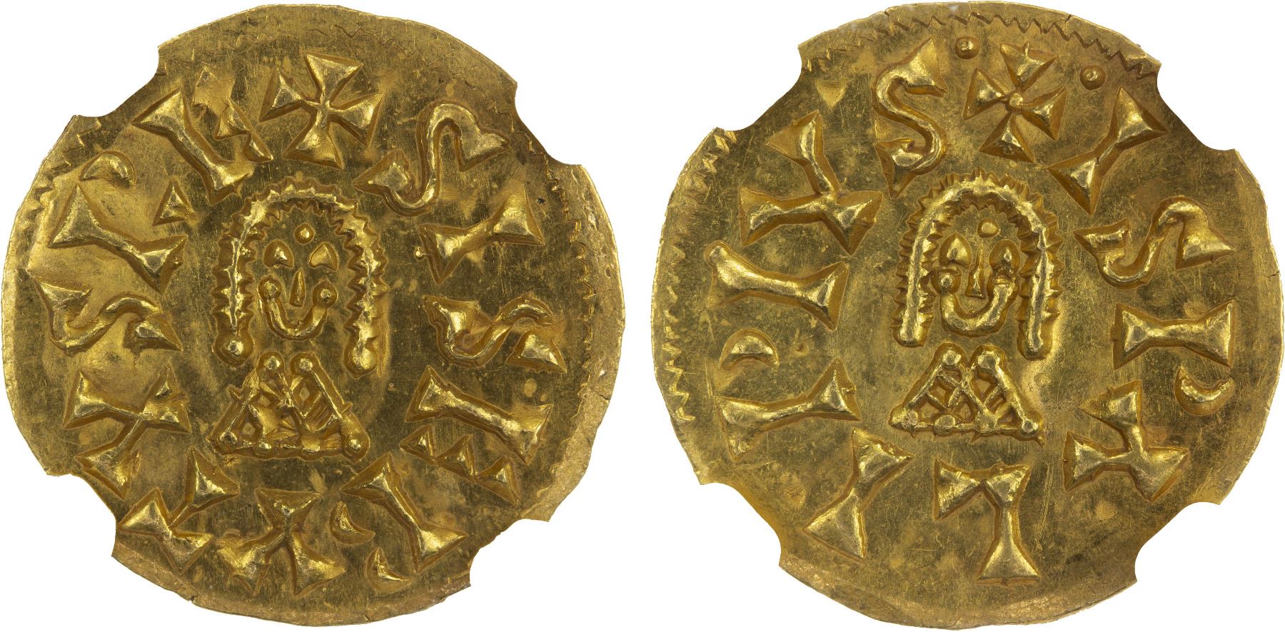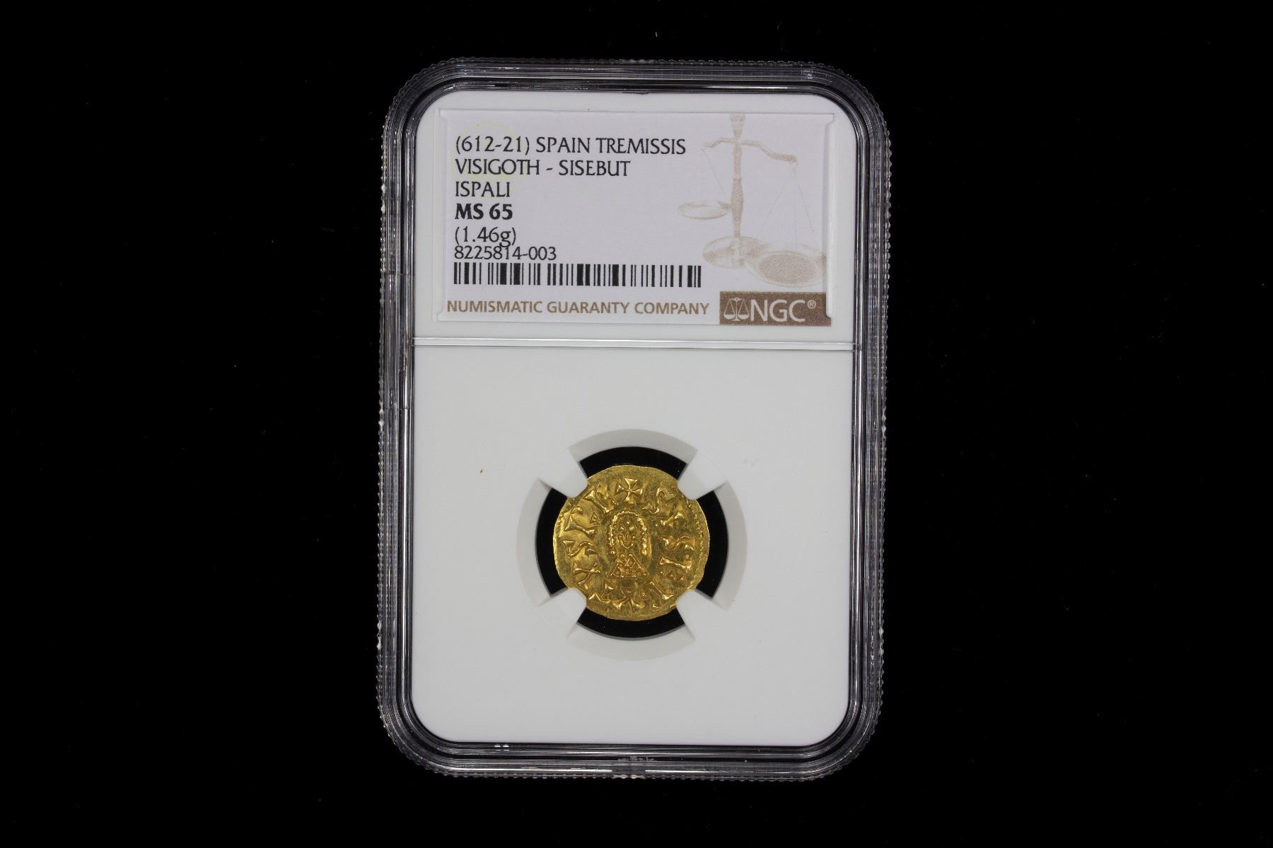 VISIGOTHS IN SPAIN: Sisebut, 612-621, AV tremissis (1.46g), Ispali (Sevilla), Pliego-274d, bust facing, + SISEBVTVS RE // bust facing, ISPALI PIVS, blazing golden luster, one of the finest examples of this type, NGC graded MS65.