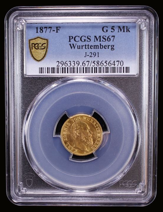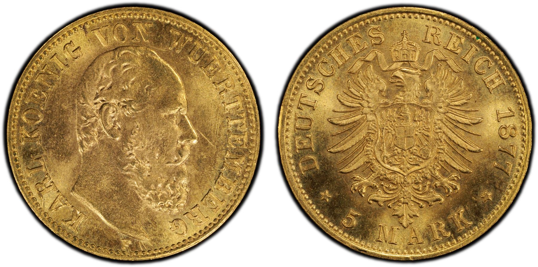 WÜRTTEMBERG: Friedrich I, 1856-1907, AV 5 mark, 1877-F, PCGS MS67